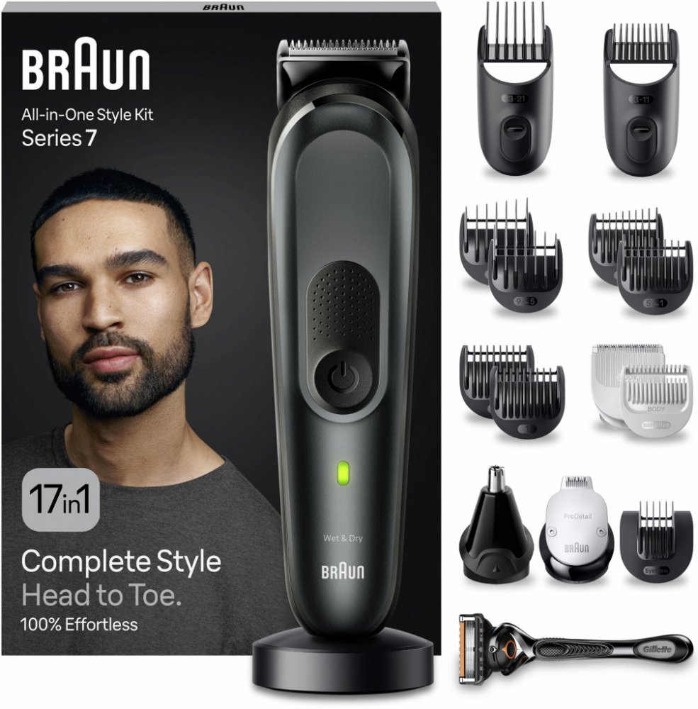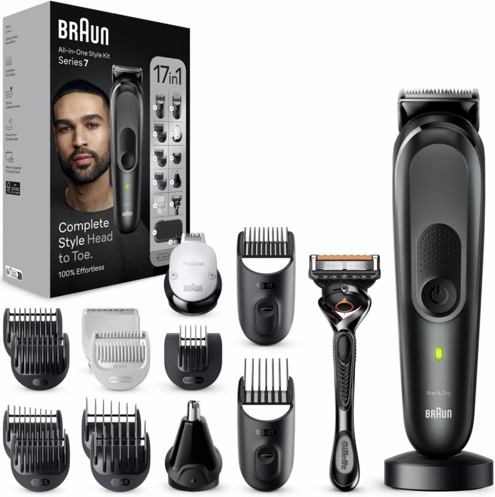 Zastřihovací sada Braun All-In-One Series 7 MGK7491Zažijte luxusní péči na profesionální úrovni v pohodlí vašeho domova. Objevte všestrannou péči o svůj vzhled se sadou pro styling BRAUN Série 7 MGK7491. Tento profesionální zastřihovač kombinuje precizní technologii, výkonný akumulátor a širokou škálu nástavců, díky nimž zvládnete dokonalý styling vousů, vlasů i chloupků po celém těle. Inovativní čepel ProBlade a inteligentní technologie AutoSense se postarají o hladký a přesný výsledek při každém použití – a to s maximálním komfortem, ať už doma nebo na cestách. Klíčové vlastnosti sady Braun All-In-One Series 7 MGK7491V černém barevném provedeníProfesionální péče v pohodlí domova – dokonalý styling vousů, vlasů i chloupků po celém těleInovativní čepel ProBlade – precizní a hladké holení i na těžko přístupných místechTechnologie AutoSense – automaticky se přizpůsobí hustotě a délce vousů pro rovnoměrný výsledekAž 100 minut bezdrátového provozu – výkonný...