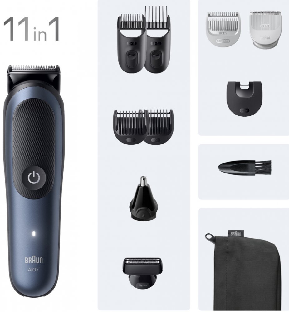 Zastřihovač Braun Series 7 All‑in‑One kombinuje plně kovový ProBlade, 11 nástavců a 14 délek (0,5–21 mm) pro flexibilní úpravu vousů, vlasů i těla. Přístroj je 100% vodotěsný, snadno se čistí a s Li‑Ion baterií nabídne až 120 minut provozu po nabití přibližně 90 minut.