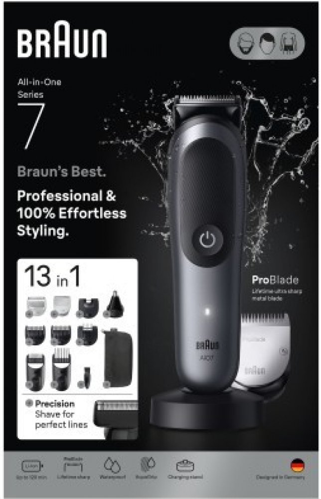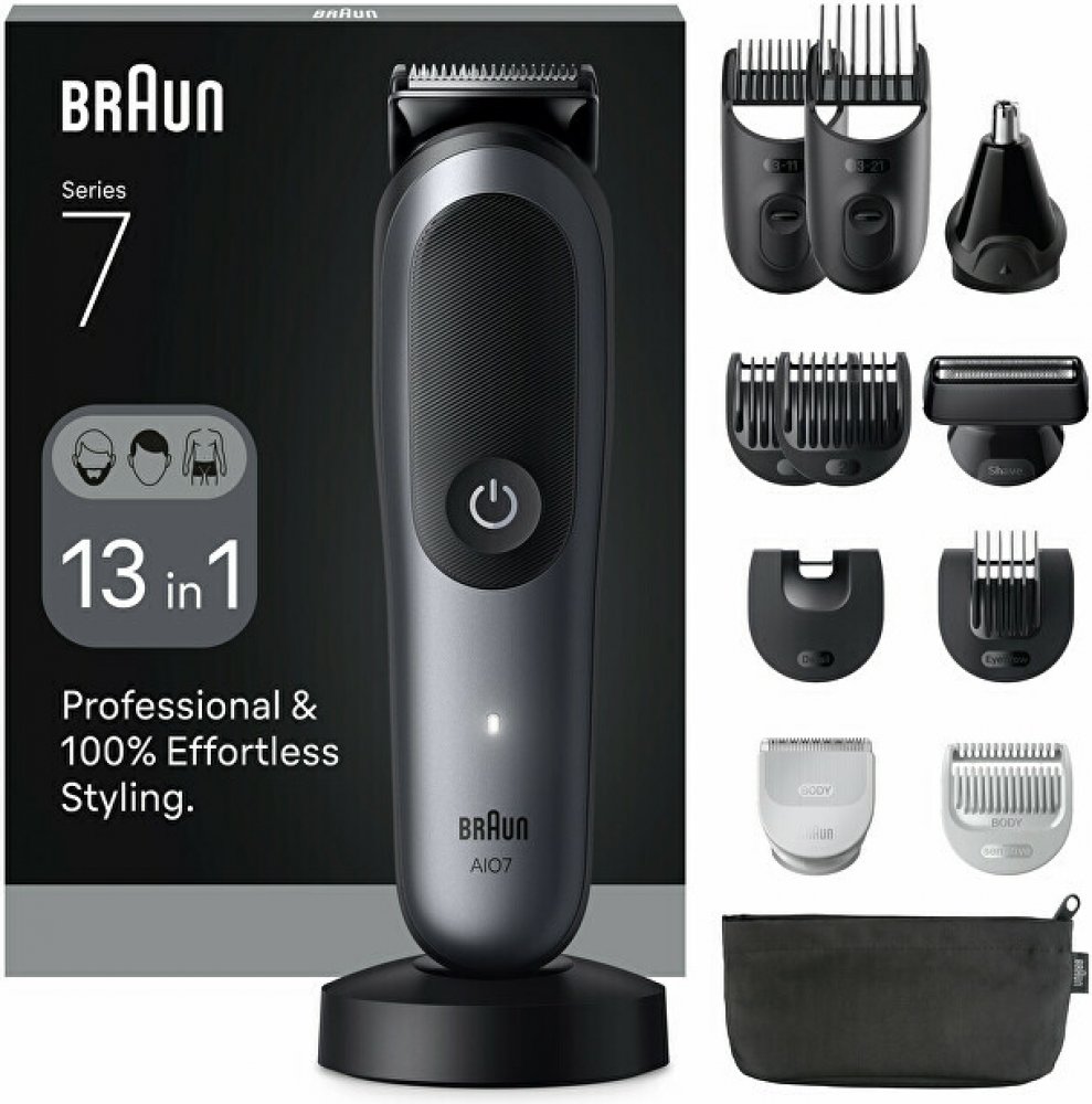 Profesionální sada Braun Series 7 AIO7560 přináší revoluci v péči o tělo, vousy a vlasy. S 13 funkcemi v jednom zařízení se přizpůsobí vašim potřebám díky technologii AutoSense, která rozpozná hustotu chloupků. Extrémně ostrý břit ProBlade a tělový nástavec s SkinGuard zaručují bezpečnou a přesnou úpravu i v citlivých oblastech. Voděodolné provedení a dlouhá výdrž na jedno nabití činí z této sady ...