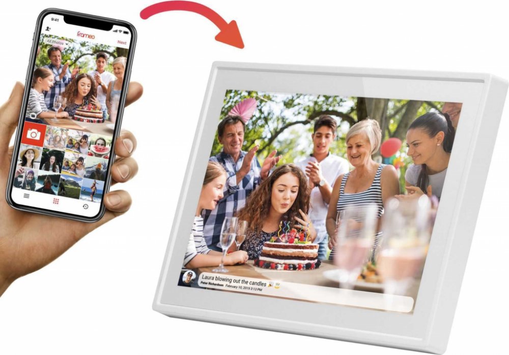 WiFi digitální fotorámeček s úhlopříčkou 10", rozlišení 1280x800px, 16:10 IPS, přehrávání JPEG/MP3/Video, 16GB interní paněť, aplikace FRAMEO (Android/iOS, FREE) pro zasílání obrázků a videí z telefonu, G-senzor pro h/v pozici, micro SDHC slot, micro USB, bílý. WLAN modul 802.11 b/g/n, opěrka na stůl, jednoduchá obsluha a nastavení pomocí bezplatné aplikace FRAMEO, ideální pro aktualizaci obsahu a nastavení rámečku z telefonu doma i na cestách, možnost horizontálního i vertikálního provozu, vnitřní paměť pro až 999 obrázků, maximální doba pro video 15s, , micro SD karty do 32GB. Rozměry 267x195x23mm, hmotnost 540g, síťový zdroj 5V/2A. Podporované formáty: JPEG, MP3, VIDEOVelikost LCD: 10" 16:10