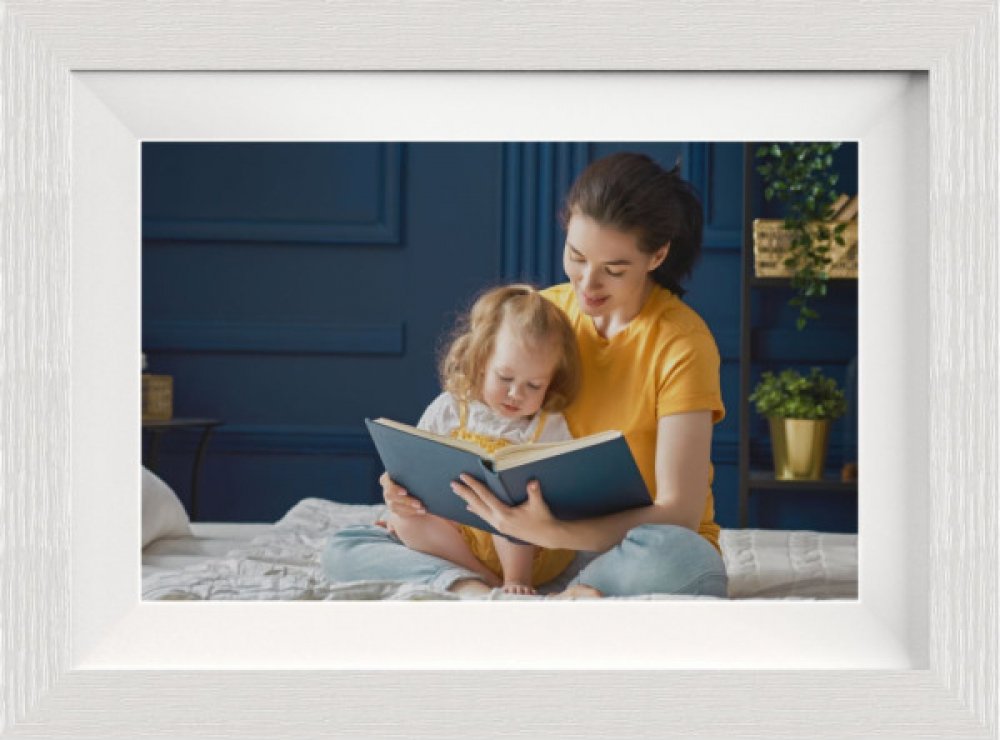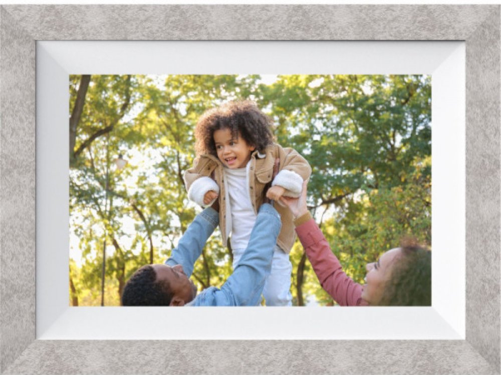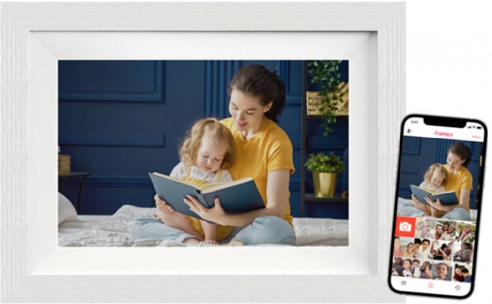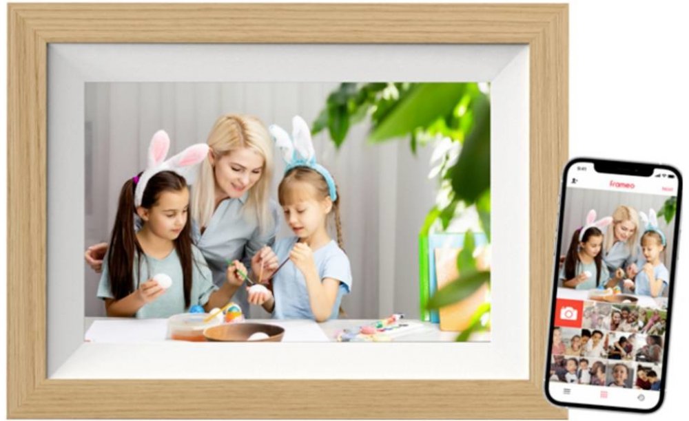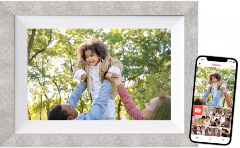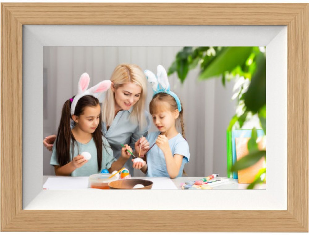 WiFi digitální fotorámeček s úhlopříčkou 10"/25,7cm, rozlišení 1280x800px, 16:10 IPS dotykový, přehrávání JPEG/MP3/Video, aplikace FRAMEO pro zasílání obrázků a videí z telefonu, vnitřní paměť 32GB, USB2 a micro SD slot max 32GB, rozměry 265x183x24mm, hmotnost 690g, data USB-C/ síťový zdroj 5V/2A. WiFi 2,4GHz, WLAN modul 802.11 b/g/n, opěrka na stůl, jednoduchá obsluha a nastavení pomocí bezplatné aplikace FRAMEO (Android/iOS), ideální pro aktualizaci obsahu a nastavení rámečku z telefonu doma i na cestách, maximální počet 10 000 záznamů a doba pro video 15s, reproduktory 2x2W, G-senzor pro horizontální i vertikální pozici, formáty foto JPG, PNG a video MP4, energetická kategorie C, menu v jazycích CZ, DE, GB, FR, NL, PL, IT, SI, HR, ES, PT, RO, GR, bílý s Beech odnímatelným rámečkem.