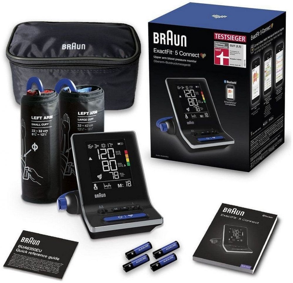 Braun černé bateriové 60 měření na paži pro cestování (na baterie) klinicky validované pro páry (2 profily) oscilometrické automatické 0 - 300 mmHg 1010 g pro synchronizaci s telefonem (Bluetooth/aplikace) univerzální dvoudílná s hadičkou