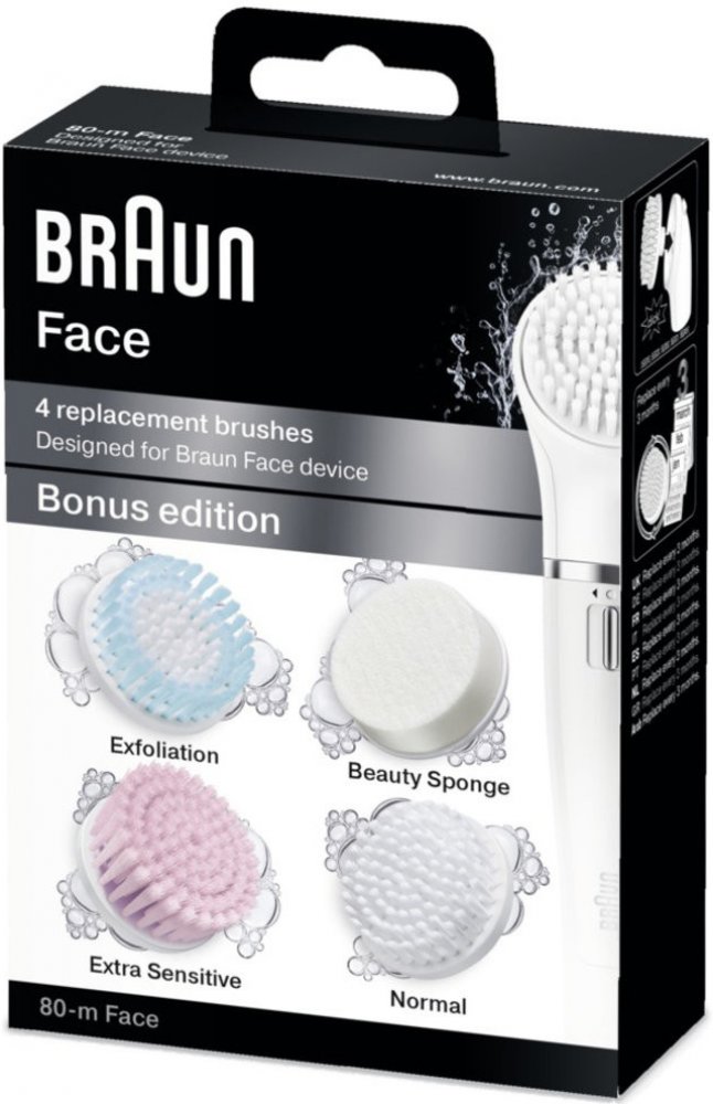 * Obsahuje všechny 4 náhradní kartáčky (Normální, Sensitive, Exfoliační a kosmetickou houbičku) pro obličejový epilátor s čistícím kartáčkem k výrobkům Braun Face 810, 820, 830 a 831