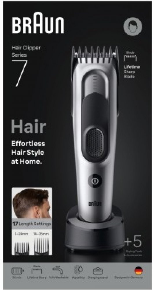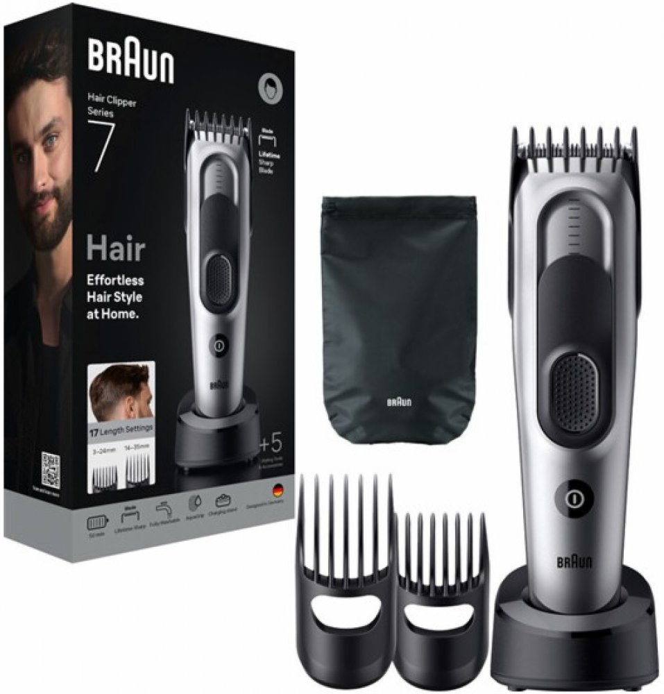 Se zastřihovačem Braun Hair Clipper Series 7 HC7590 si můžete snadno a rychle upravit vlasy přímo v pohodlí vašeho domova. Díky extrémně ostrým břitům si hravě poradí i s hustými vlasy a s jakoukoli délkou. Součástí balení jsou dva posuvné hřebenové nástavce, které umožňují nastavení délky střihu v rozmezí 3-24 mm a 14-35 mm. Funkce Memory Lock si pamatuje poslední nastavení, což usnadňuje opakova...