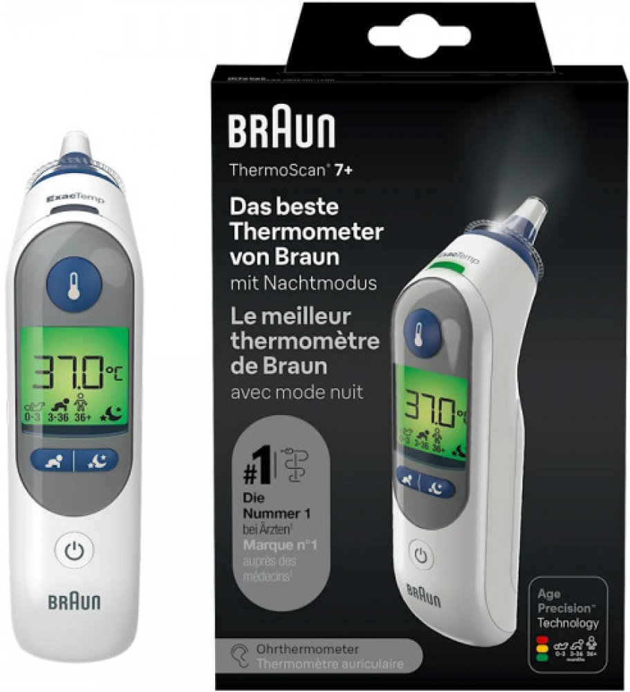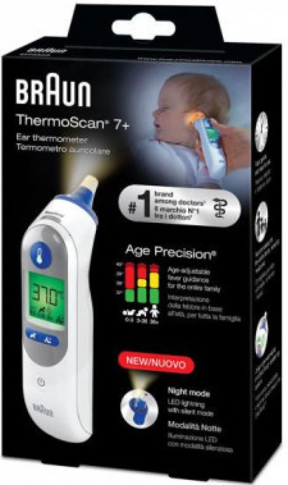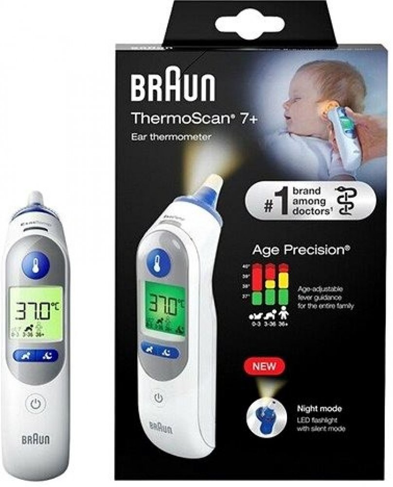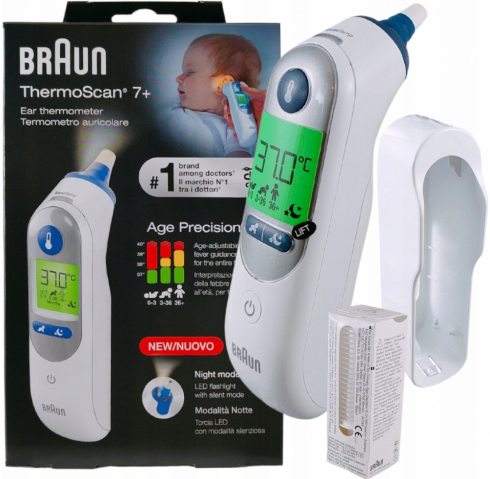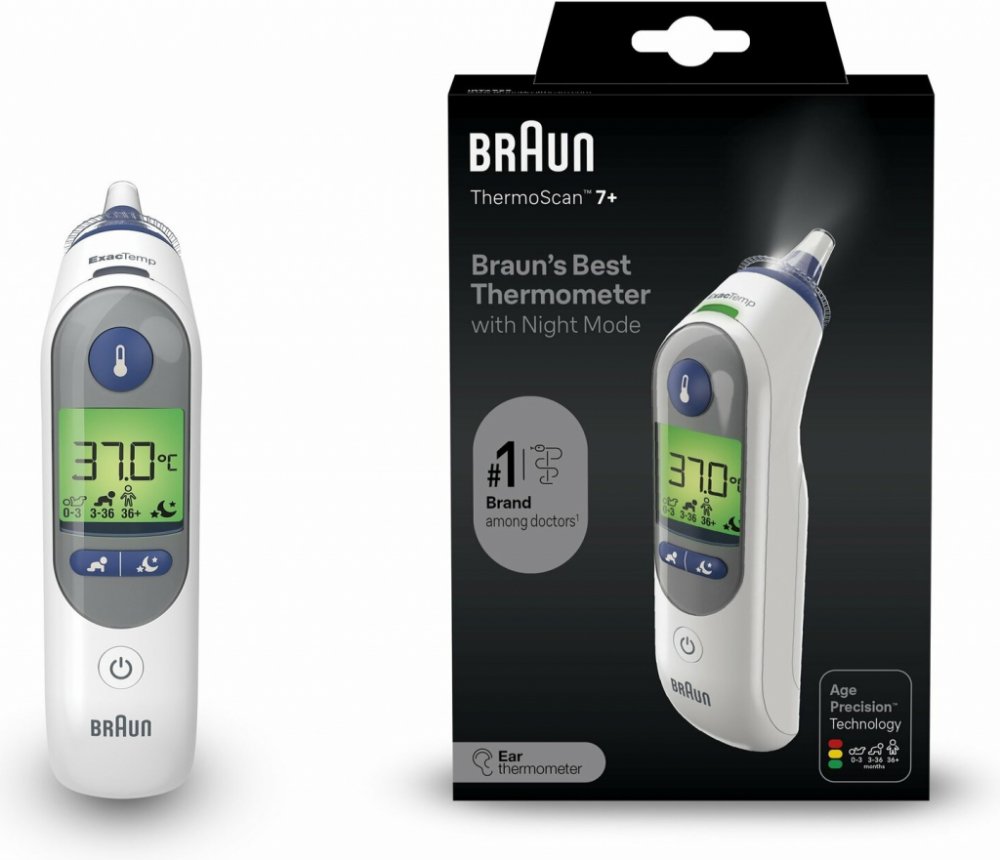 Rychlý, šetrný a snadno použitelný. Definice horečky se mění s věkem. Ušní teploměr Braun ThermoScan 7+ je vybaven patentovanou technologií Age Precision - věkově nastavitelným ukazatelem horečky, který zohledňuje věk a zbavuje měření teploty dohadů. Teploměr je vybaven nočním režimem, který je vybaven světlem pro snadné použití ve tmě, a tichým režimem, aby se zabránilo buzení.