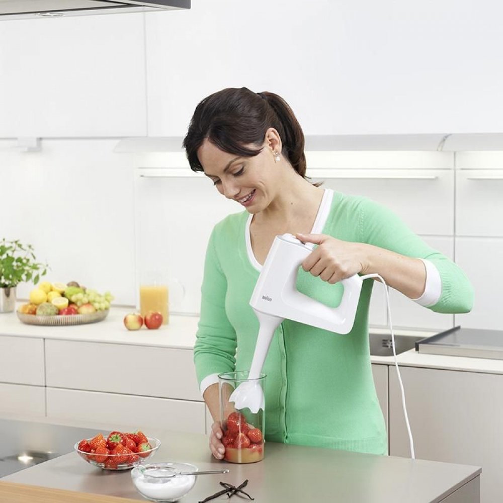 Ruční mixér Braun MultiMix 3 nabízí 500W výkonný motor a 5 rychlostí pro snadné a rychlé šlehání, hnětení a mixování. Mixér současně nabízí také mixovací nohu s plastovou mixovací nádobou a u vybraných modelů také sekací nástavec, takže se v okamžiku stává tyčovým mixérem a sekáčkem. Technologie SmartMix a unikátní umístění motoru přímo nad příslušenství přenáší váhu přímo do mísy, nikoliv do vaší ruky, takže je šlehání a mixování až o 40 % lehčí. Design mixéru MultiMix je hladký a bez ventilačních otvorů. Díky tomu dovnitř mixéru nepronikají nečistoty a je zajištěna delší životnost produktu. Protiskluzová měkká rukojeť SoftGrip a snadná výměna příslušenství je příjemnou tečkou.