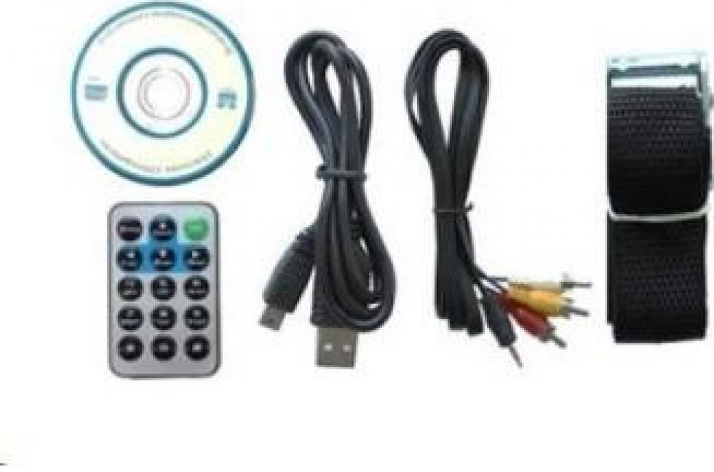 V dodávce instalační CD, kabely USB/AV, dálkové ovládání a řemen na uchycení.