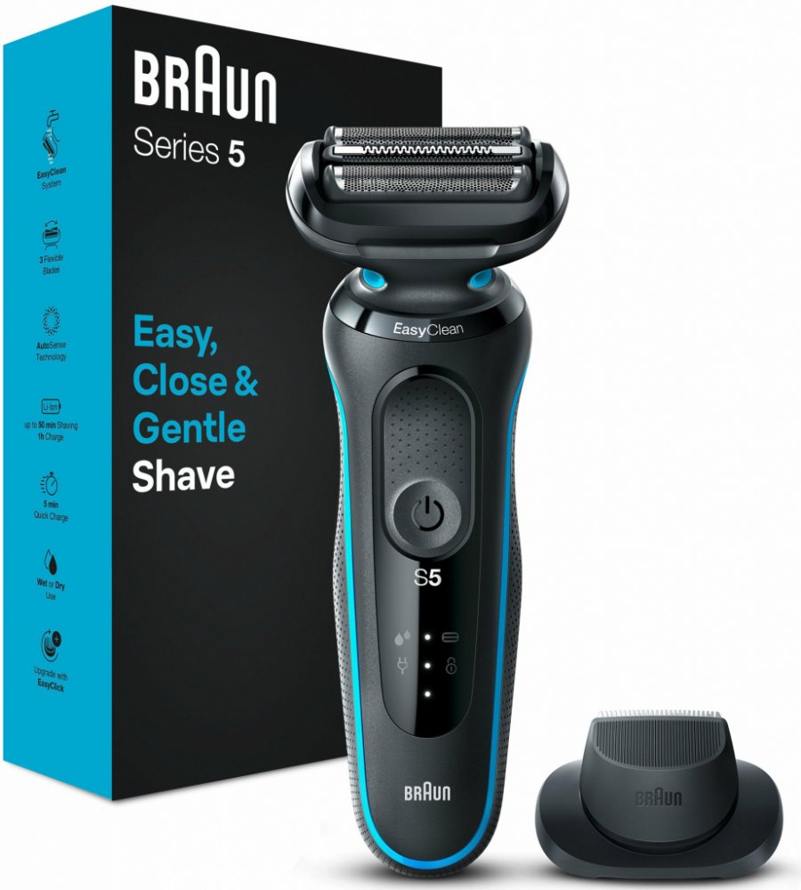 Braun Elektrický holicí strojek Series 5 51-M1200s Snadné oholení díky 3 pružným břitům, které se optimálně přizpůsobí tvaru obličeje Technologie AutoSense: holicí strojek analyzuje hustotu vašich vousů a automaticky upravuje výkon motoru Systém EasyClean nabízí rychlé a snadné čištění bez demontáže holicí hlavy Li-Ion baterie zaručuje dobu provozu až 3 týdny Rychlé nabíjení cca 5 minut – postačí ...
