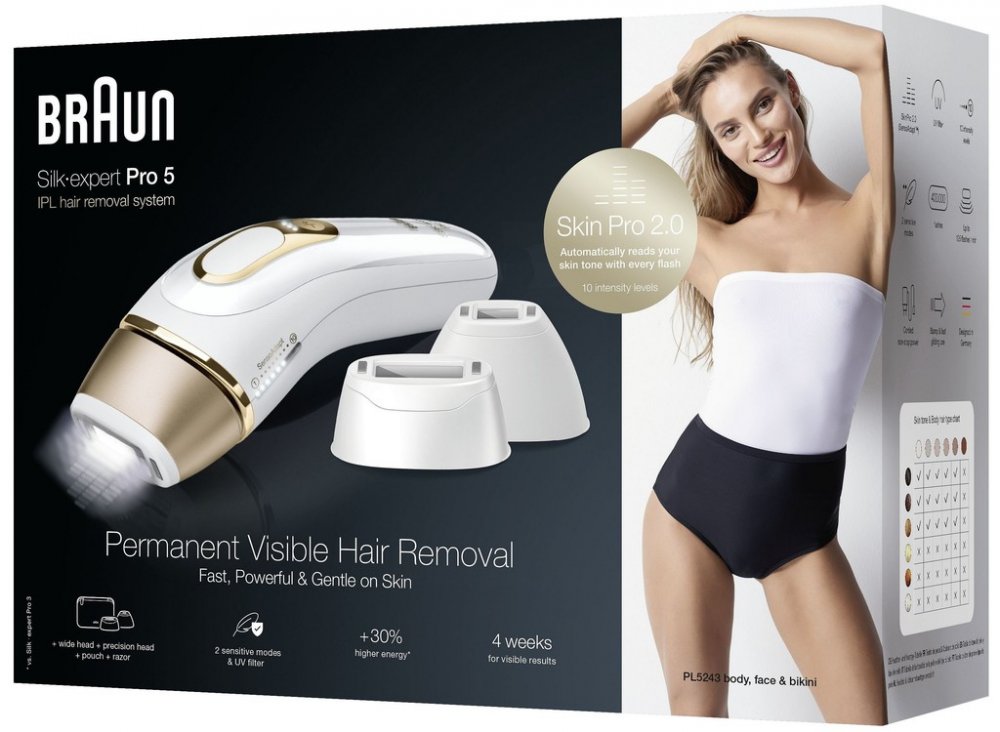 IPL epilátor Braun IPL Silk·expert Pro 5 PL5243Braun Silk·expert Pro 5 PL5243 je výkonný IPL epilátor pro domácí použití, přinášející salonní výsledky bez nutnosti návštěvy kliniky. Díky technologii SkinPro 2.0 (SensoAdapt™) detekuje odstín pokožky až 80× za sekundu a automaticky upravuje intenzitu záblesků pro bezpečné a efektivní ošetření. Přístroj vysílá až 125 záblesků za minutu, což umožňuje rychlé a rovnoměrné ošetření větších partií těla. K dispozici jsou tři hlavice – standardní, přesná a široká – pro použití od nohou a paží po obličej a citlivých oblastí. Dva režimy pro citlivou pleť umožňují snížit intenzitu světla v citlivých zónách, jako jsou podpaží či bikiní oblast. Výsledkem je viditelná redukce chloupků během cca 4 týdnů a hladká pokožka až na 6 měsíců. Součástí balení je také holicí strojek Venus Extra Smooth a měkké cestovní pouzdro pro pohodlné uskladnění a přenos. Klíčové vlastnosti IPL epilátoru Braun IPL Silk·expert Pro 5 PL5243Technologie SkinPro 2.0...