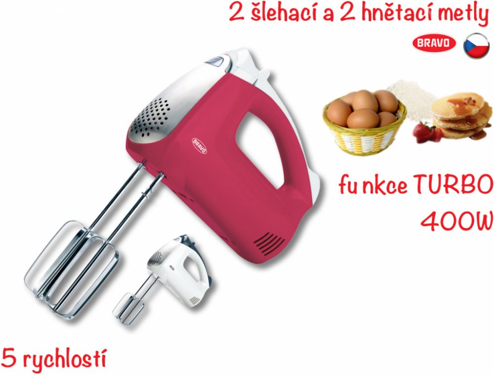 Praktický šlehač do ruky za dobrou cenu. Výkonný ruční šlehač, který má 5 rychlostních stupňů + tlačítko TURBO. Součástí jsou 2 šlehací a 2 hnětací metly z nerez oceli .