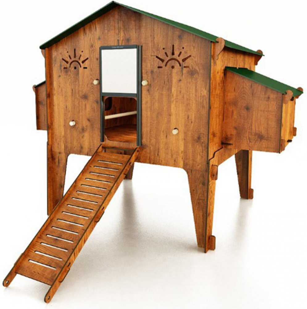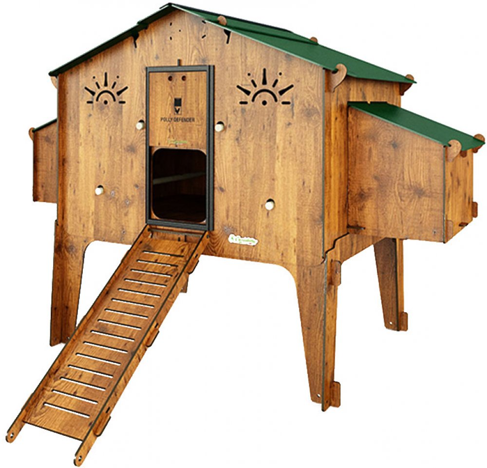 Kurník pro slepice je vybaven čtyřmi hřady pro noční odpočinek slepic. Součástí kurníku jsou také čtyři vnější kukaně, v kterých budou mít slepice dostatek prostoru a klidu pro snášení vajec. Získávání vajíček přitom bude velice jednoduché, jelikož k jejich vyzvednutí stačí pouze zvednout střechu snáškových hnízd. Díky tomu, že je kurník vyvýšen na nožkách 50 cm od země, tak poskytuje slepicím i během dne ochranu před sluncem či deštěm. Tento prostor pod kurníkem je ideální k umístění napáječek a krmítek. Do kurníku mají slepice během dne pohodlný přístup přes žebřík. Součástí balení jsou bezpečnostní dvířka značky ChickenGuard, na které můžete v případě zájmu snadno připojit automatické otevírání kurníku. Automatické otevírání a zavírání kurníku není součástí balení!