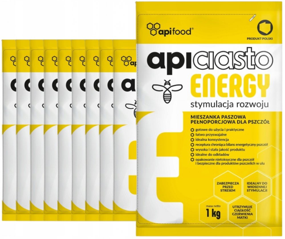 Těsto pro včely, kompletní krmná směs. ApiCiasto Energy obsahuje přibližně 85 % sušiny, díky čemuž zajišťuje bezpečný a snadný přístup k potravě pro včely.