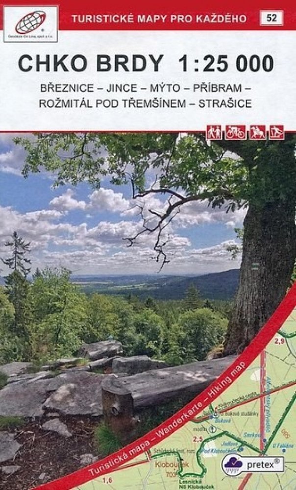 Nejpodrobnější oboustranná turistická a cykloturistická mapa CHKO Brdy v měřítku 1:25 000 na speciálním papíře pretex®. Mapa zobrazuje území CHKO Brdy: Strašicko a Rožmitálsko: Březnice - Jince - Mýto - Příbram - Rožmitál pod Třemšínem - Strašice. Podrobná mapa zobrazuje základní polohopisné a výškopisné informace např. silnice, zpevněné a nezpevněné cesty,železnici, sídla a jejich části včetně osad a samot, vodní plochy a toky, ostatní plochy (např. lesy, zahrady a sady, vinice, chmelnice), výškové kóty, vrstevnice po 10 m, apod. Mapa dále obsahuje pásové a místní turistické značení, turistické směrovníky, kilometráž, cykloturistické trasy, naučné stezky, turistické lyžařské trasy, sjezdové tratě, lanovky a vleky, jezdecké trasy a samozřejmě zobrazuje pro turisty atraktivní místa - hrady a zámky, rozhledny a místa rozhledu, zříceniny a jiné památky, muzea a galerie, koupaliště, vybrané restaurace a ubytovací zařízení, apod.