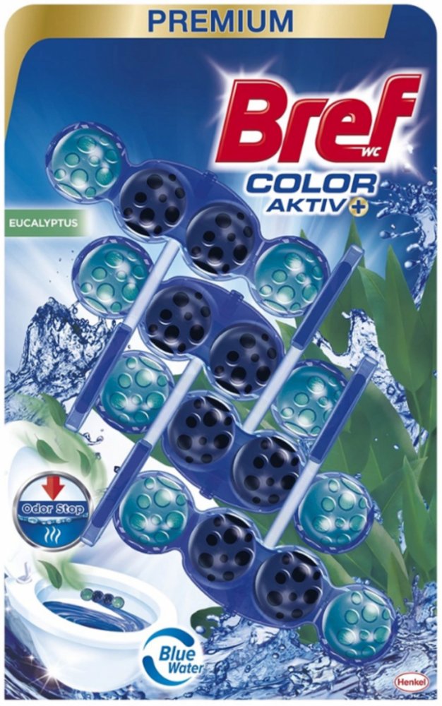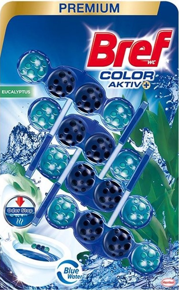 Bref Color Aktiv WC blok s technologií Odor Stop vytváří ochrannou bariéru proti nepříjemným zápachům a zároveň uvolňuje dlouhotrvající svěžest. Zažijte neutralizaci zápachu po každém spláchnutí s přidanou hodnotou vůně eukalyptu. Viditelné čištění je zajištěno vodou zabarvenou do modra a vaši toaletu provoní dlouhotrvající vůně eukalyptu. Bref Color Aktiv WC blok má složení se 4 funkcemi: