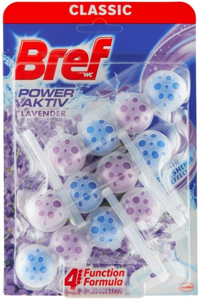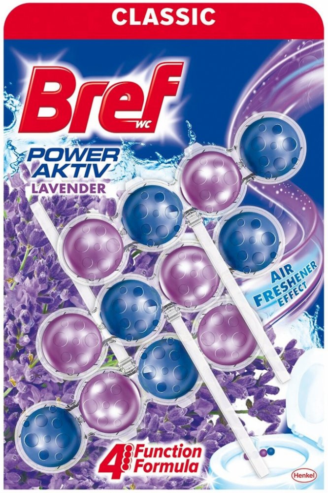 Bref Power Aktiv Lavender Field WC kuličky díky svému jedinečnému složení se 4 funkcemi zabraňují usazování vodního kamene, vytváří účinnou čisticí pěnu, zabraňuje usazování nečistot a dodává vaší toaletě extra svěžest. Jednoduše umístěte produkt pod okraj záchodové mísy, nastavte jej na proud vody a ucítíte svěžest a čistotu vaší toalety s každým spláchnutím! Bref Power Aktiv vydrží až 240 spláchnutí. WC blok Bref Power Aktiv udrží vaši toaletu hygienicky čistou s každým spláchnutím, navíc ji ozvláštní zajímavým designem. Atraktivní balení v podobě čtyř kuliček nabízí čtyři funkce, které zaručují dokonalou péči o toaletní mísu: hygienická čistota, čistící pěna, ochrana před vodním kamenem a dlouhotrvající svěžest.