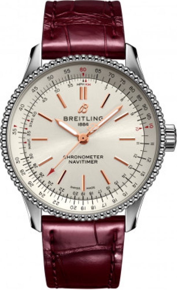 Luxusní hodinky Breitling Navitimer Automatic 35 Automat, 35 mm. Hodinky disponují funkcemi luminiscence. Základní parametry hodinek jsou: barva číselníku je stříbrná, typ strojku je mechanické hodinky s automatickým nátahem, materiál řemínku je kůže a vodotěsnost je 30 m.