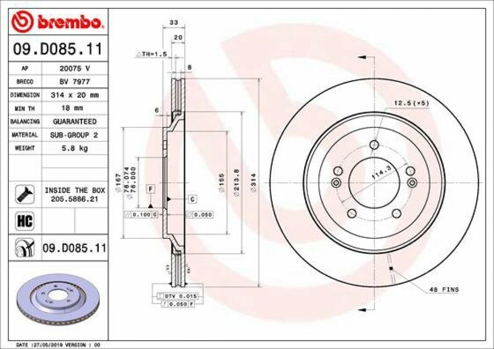 Technické parametry:Typ brzdového kotouče: vnitřně větránoSíla brzdového kotouče [mm]: 20Počet děr: 5Doplňující výrobek/info 2: se šroubyVýška [mm]: 33Centrovací průměr [mm]: 76Vnější průměr [mm]: 314Zpracování: vysoce nauhličenoPovrch: nátěrMinimální tloušťka [mm]: 18OEM číslo::Aftermarket: BV7977, 313469, 92296203, 55962, 20075V, MDC2843C; HYUNDAI: 58411S0500