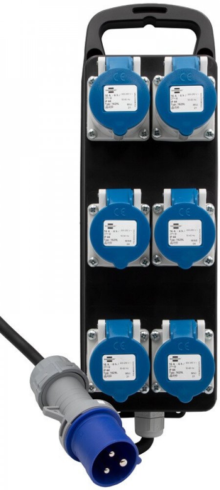 6 zásuvek CEE 3pólových, 230V/16A (IP44).
