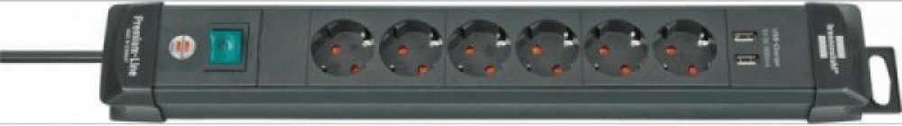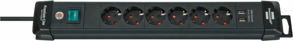 6-gang protective contact socket strip with 2 USB charging sockets (total charging current max. 3100 mA for fast charging), 3m cable length and increased contact protection.