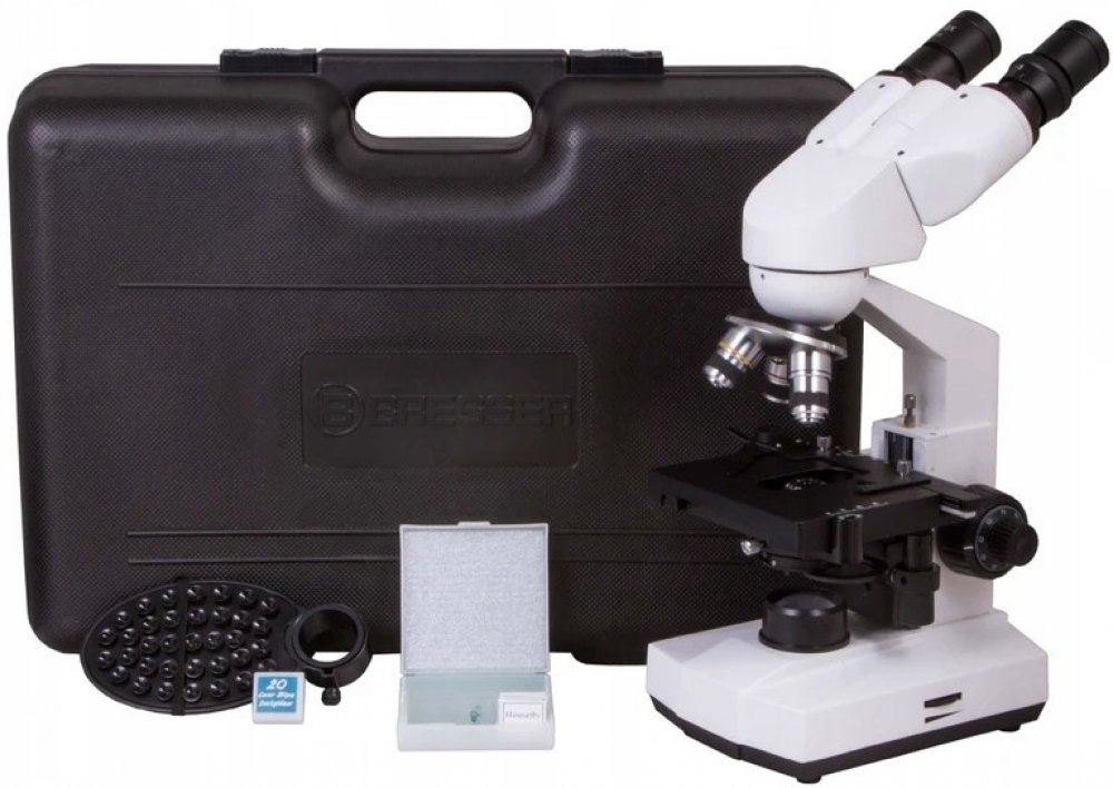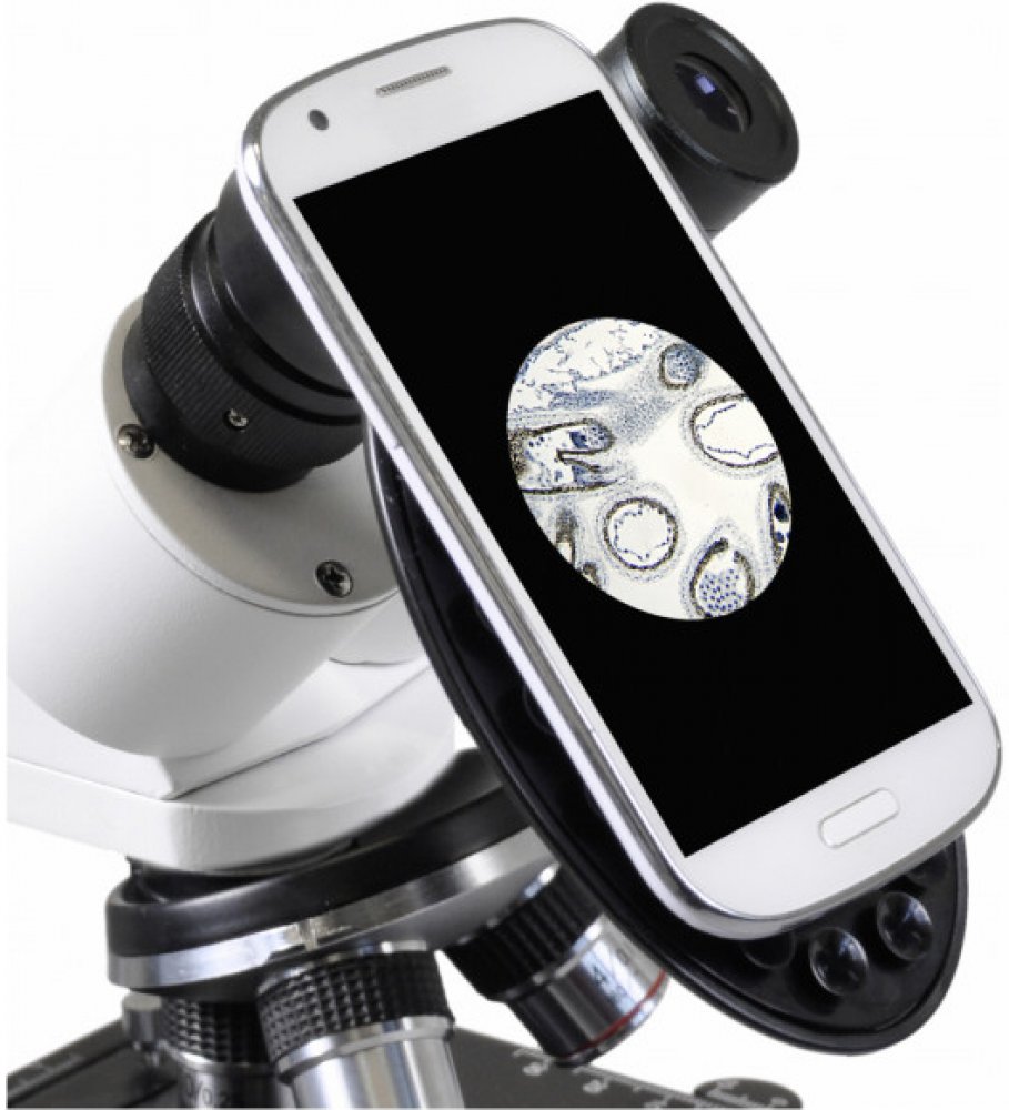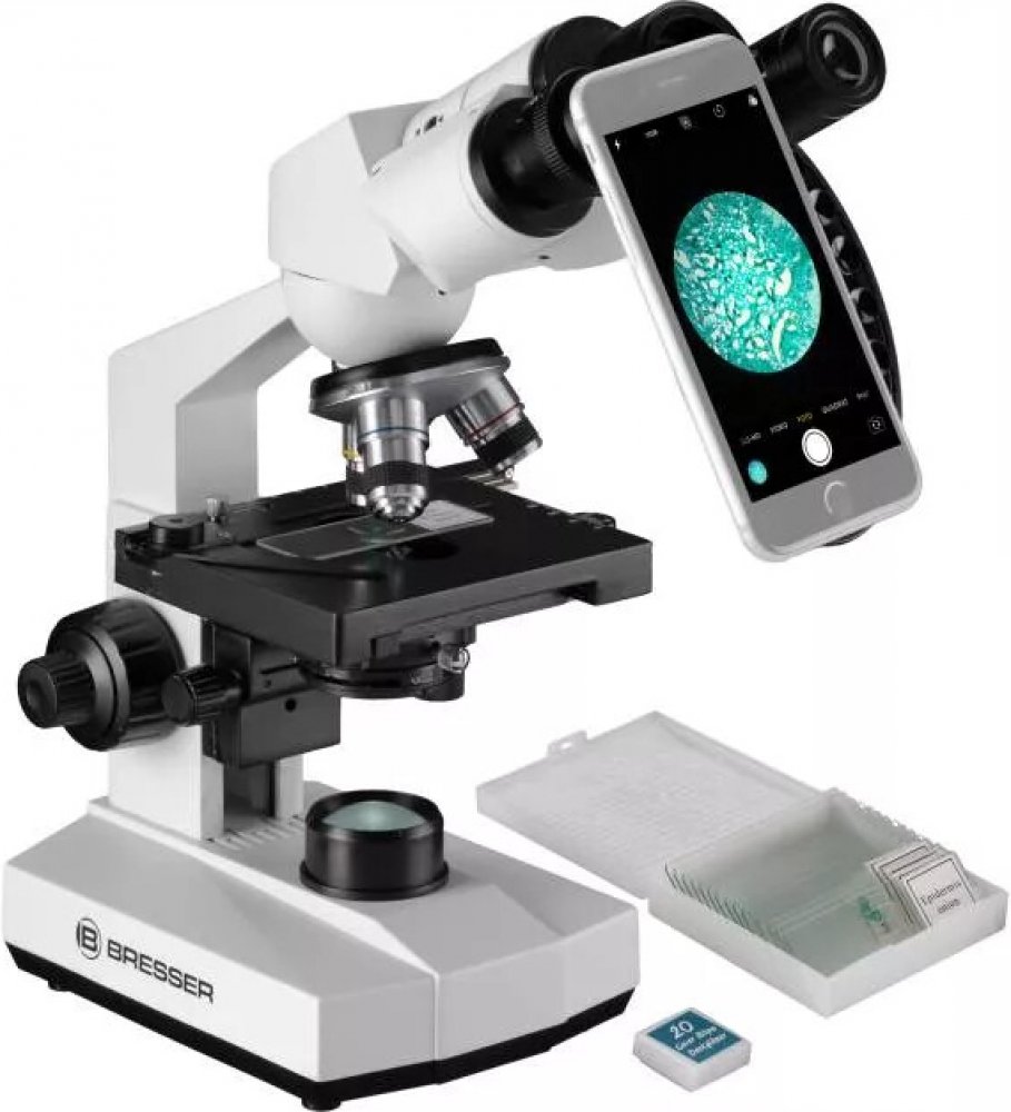 The Bresser Erudit Basic 40–400x comes with a sturdy case for transport and storage, as well as with a smartphone holder for easy and convenient documentation of microscopic images and video.
