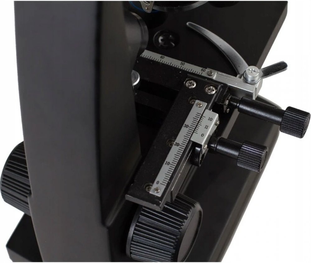 Pracovní stolek mikroskopu s posuvnými měřítky vám umožňuje nastavit pozorovaný preparát, aniž byste se jej museli dotýkat rukama. Tento model je vybaven LED osvětlením. Spodní osvětlení se používá k pozorování transparentních preparátů v procházejícím světle a horní osvětlení ke studiu neprůhledných preparátů v odraženém světle. Pod pracovním stolkem je kotouč se šesti filtry.