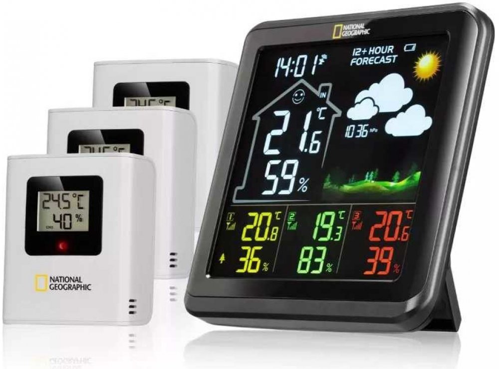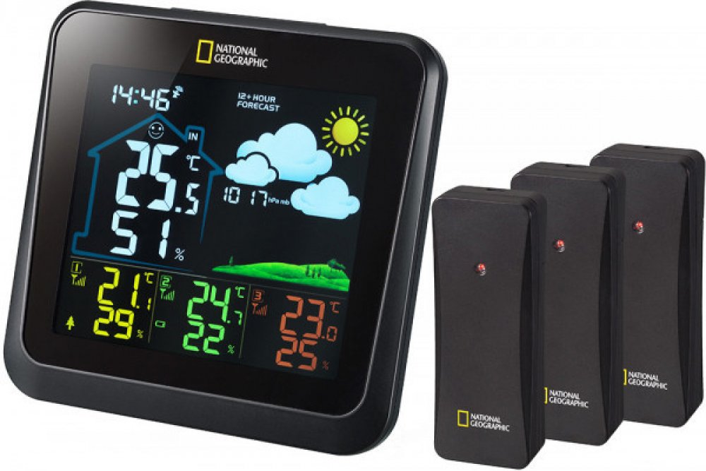 The National Geographic VA colour weather station with 4 measuring points in black displays all relevant weather data at a glance. The set includes 3 outdoor sensors and one built in sensor. On the clearly arranged colour display you will find inf
