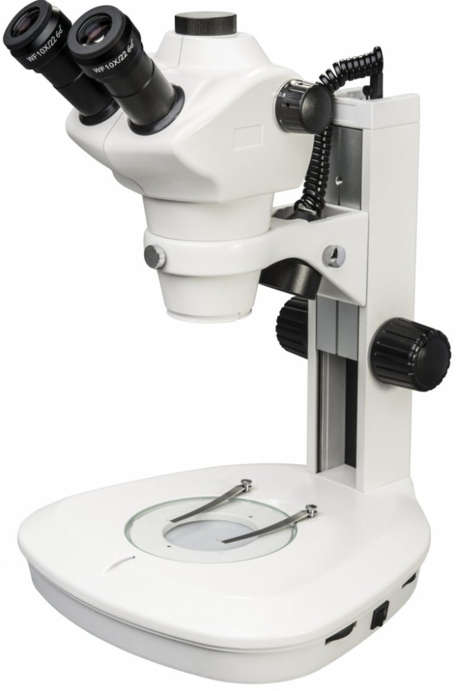 The extra wide foot with stage and exceptionally tall height range permit observations of large objects. The integrated reflected- and transmitted-light illumination can be used in combination and is dimmable. The angle of incidence can be user-friendly adjusted and locked in position. A continuous range of magnification from 8x to 50x is possible with the exchangeable wide field eyepieces (WF10x) and the 6.25-times stereo zoom objective lens (0.8x–5x).