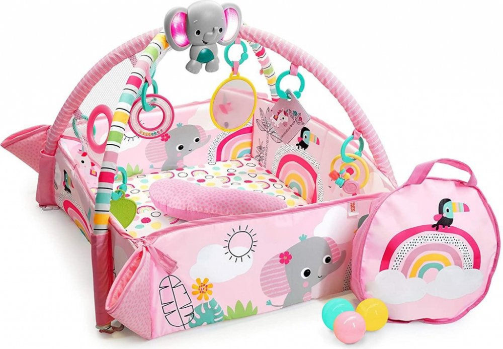 Tato deka s 5 způsoby hry je velmi flexibilní a přizpůsobí se potřebám vašeho dítěte v jakémkoliv věku. Plyšové bočnice deky můžete nastavit směrem nahoru a naplnit tak herní tělocvičnu 40 barevnými míčky, čímž poslouží jako ohrádka aby se nerozkutálely po celém pokoji. Maminka a tatínek se mohou také zapojit do akce pouštěním míčků přes otvor v síťované stříšce.