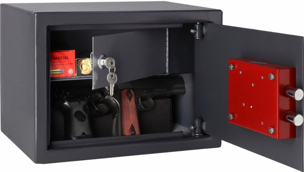 Hmotnost: 13.0000Záruční doba: 2Vyrobce: BrihardTyp zámku: Zámek na klíč. Záštita proti vytahování klíče v otevřeném stavu.Stěna: 3 mm silná ocel. Vyřezáno za pomocí high-tech technologie.Dveře: 3 mm silné, pevná ocelová konstrukce.Západky: Zámky v jednom směru, vyrobeno z masivní oceli.Kotvení: Pro zajištění základní bezpečnosti trezoru, TREZOR MUSÍ BÝT PŘIPOJEN k místům stanoveným výrobcem. trezor má na dně a na zadní stěně otvory o průměru 8 mm na upevnění pomocí šroubů.Další popis: Trezor je určen pro uložení až 2 pistolí. Uvnitř je samostatná uzamykatelná přihrádka se zámkem na klíč, vhodná pro uskladnění střeliva nebo jiné munice. Rozměry vnitřní přihrádkové vkládací schránky: výška 86 mm a šířka 235 mm. Ve spodní části trezoru je měkký koberec, který chrání předměty uložené v trezoru před poškrábáním.