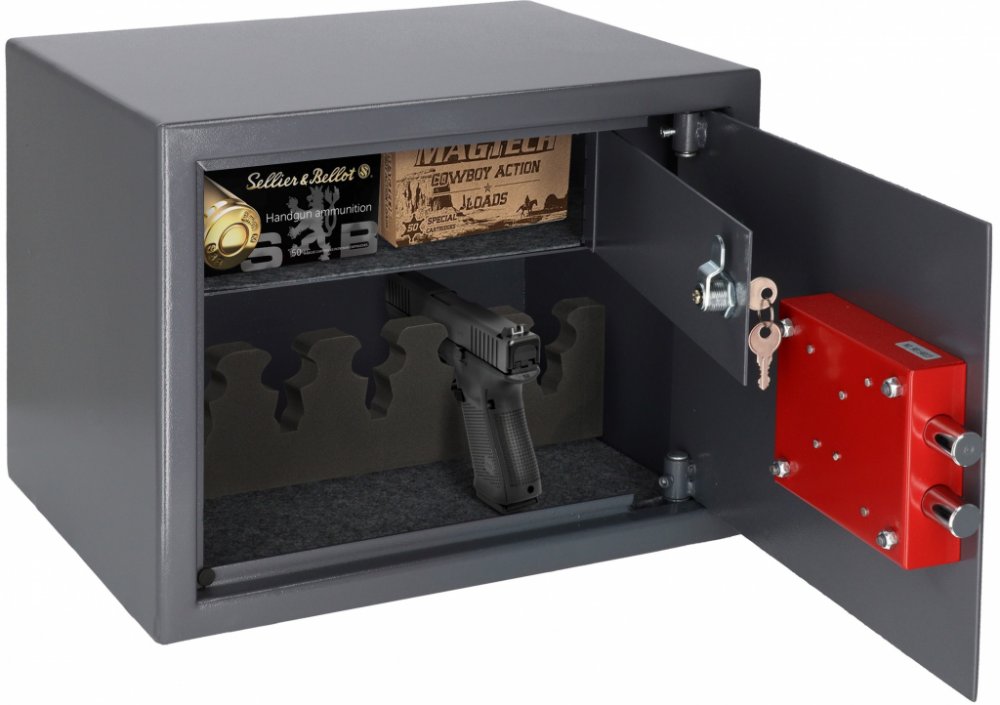 Další popis: Trezor je určen pro uložení až 2 pistolí. Uvnitř je samostatná uzamykatelná přihrádka se zámkem na klíč, vhodná pro uložení střeliva nebo jiné munice.