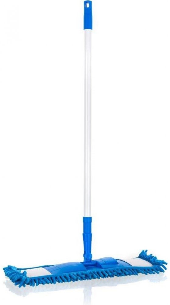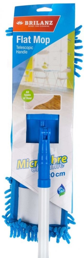 Plochý žinylkový mop od značky BRILANZ vám usnadní pravidelné mytí podlah v domácnosti. Díky teleskopické tyči nastavitelné od 68 do 120 cm už se nebudete muset k úklidu ohýbat. Materiál zvaný žinylka, složený z 80 % polyesteru a 20 % polyamidu, dokonale čistí všechny podlahové krytiny. Bílá ocelová tyč s tmavě modrými plastovými prvky skvěle padne do ruky.