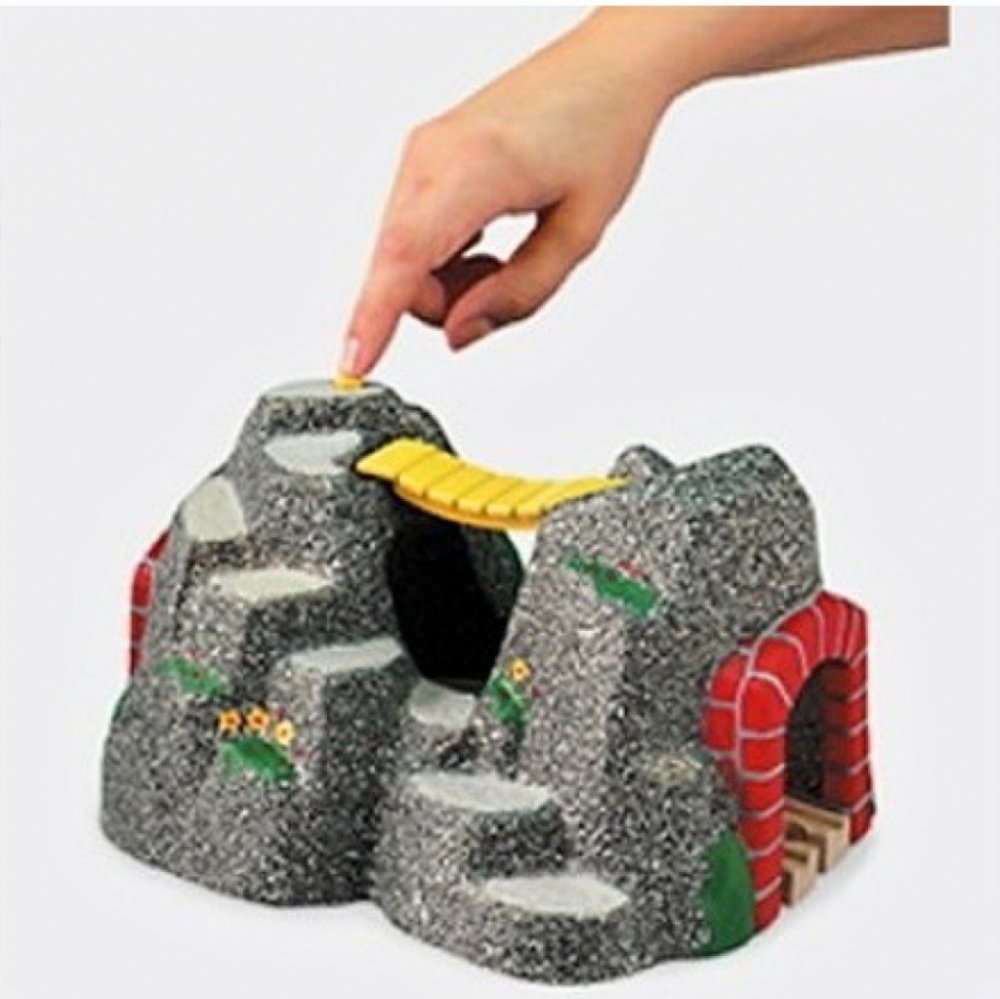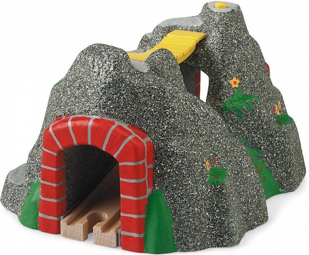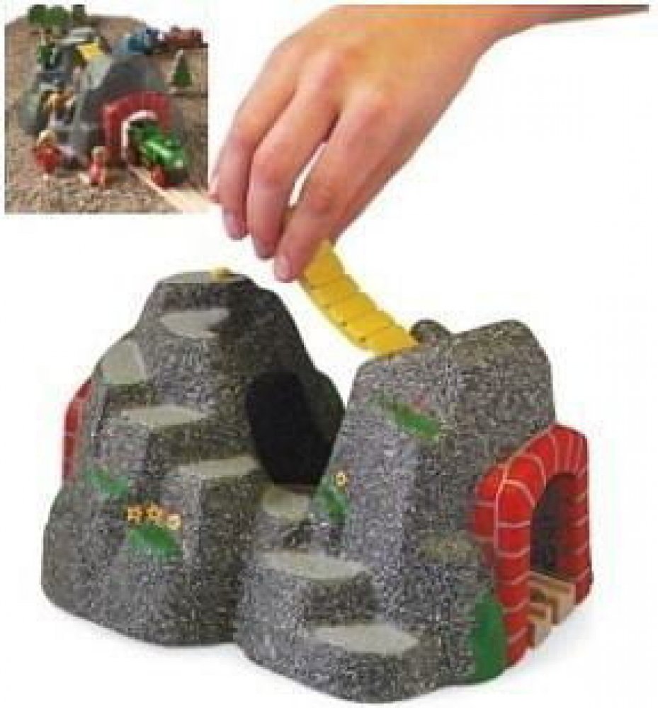 Železniční tunel k vláčkodráze. Detail kamene a porostu na obou stranách, dodává tunelu realistický vzhled. Tunel má dva vrcholy, které spojuje lávka obsahuje kromě schovaných kolejí, také automatický magnetický zvukový systém, který po vjetí soupravy dovnitř tunelu, začne vydávat 4 různé zvukové efekty - houkání před tunelem a v tunelu, práci v tunelu a funění lokomotivy.