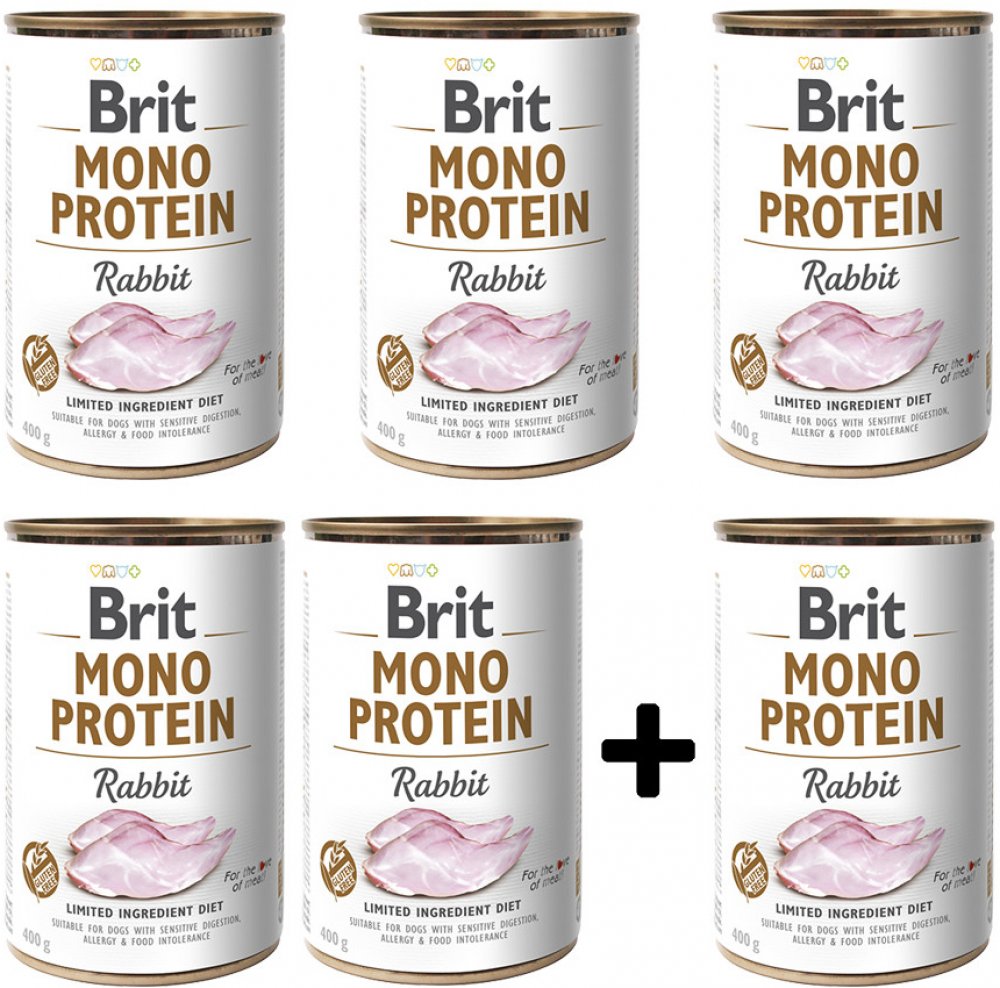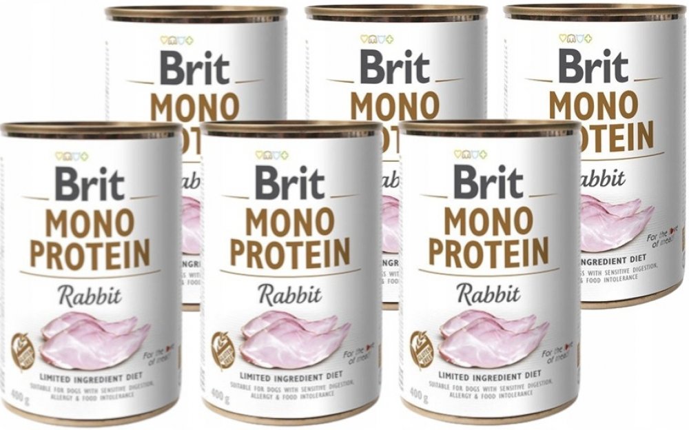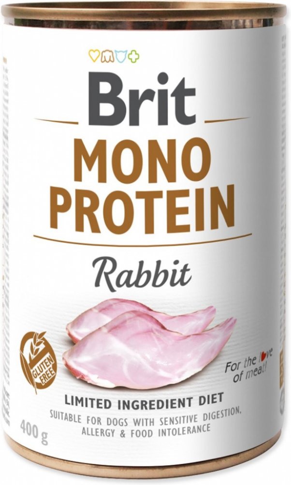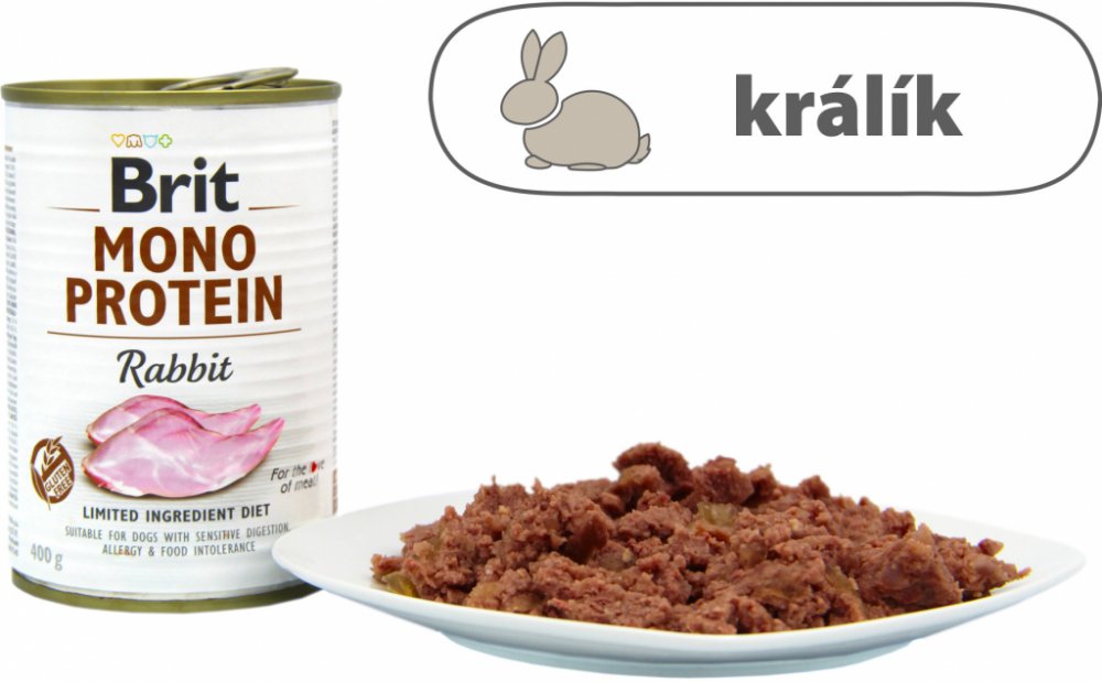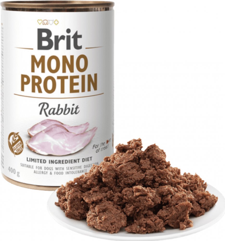 Prémiová konzerva Brit Mono Protein Rabbit je kompletní krmivo s omezeným surovinovým složením, kde základem receptury je králičí maso.