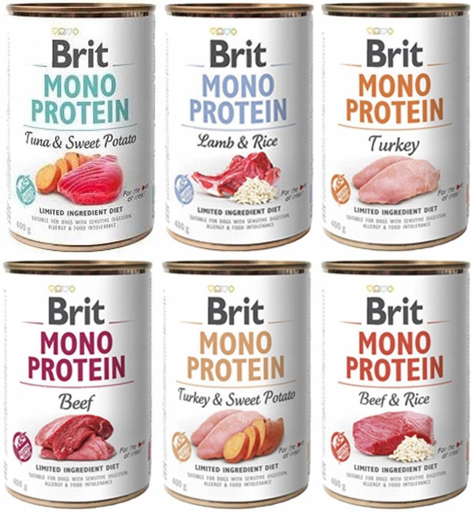Konzervy Brit Mono Protein představují praktické a kvalitní řešení pro každodenní krmení i specifické výživové potřeby. Vysoký obsah masa zaručuje skvělou chutnost i výživovou hodnotu. Receptury jsou bez obilovin, sóji a lepku. Výborně se hodí jako plnohodnotné jídlo i jako chutný doplněk ke granulím.