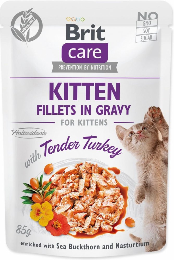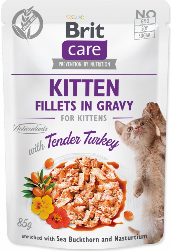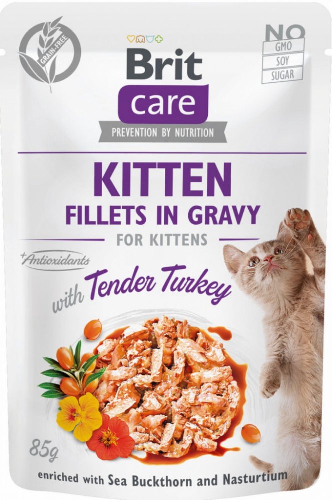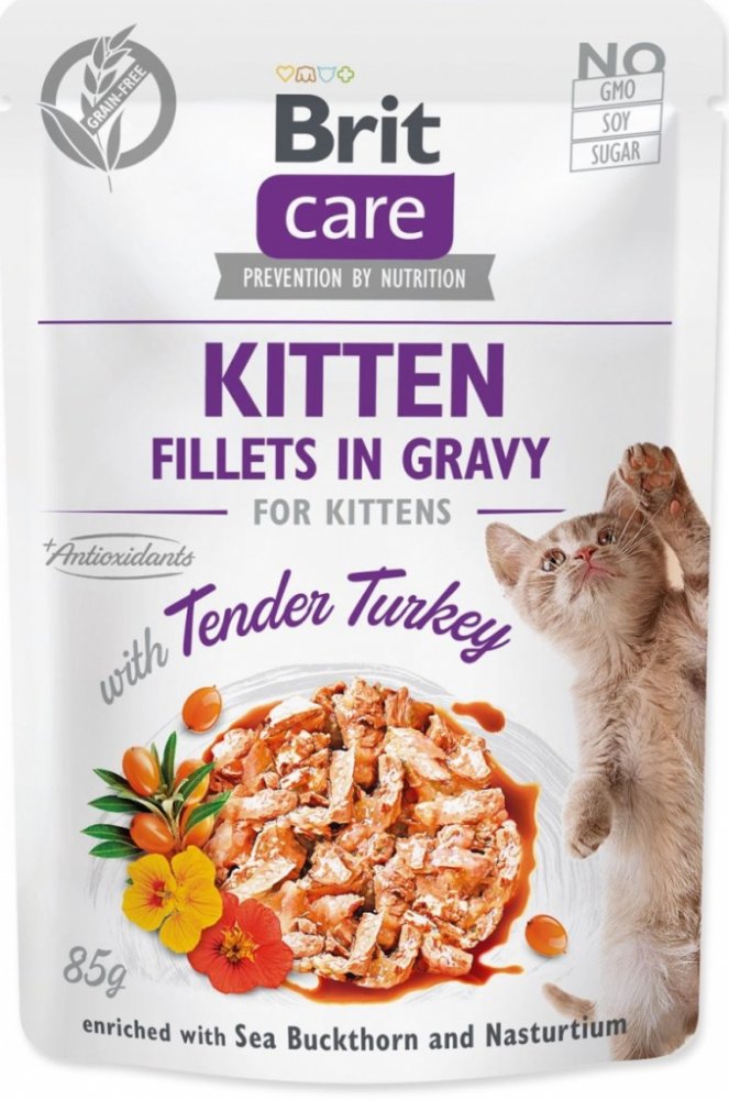 Pokud je vaše kotě vybíravé, zvolte Brit Care Cat Kitten Fillets in Gravy Turkey a budete mít po problému. Filety jemného krůtího masa zalité chutnou šťávou vaše koťátko jistě přesvědčí. Kapsičku jim snadno naservírujete a navíc touto stravou kotěti zajistíte všechny důležité složky pro zdravý růst a vývoj. Krůtí maso je skvělé pro svůj nízký obsah tuku a lehkou stravitelnost. Mimo vitaminy a minerální látky jsou kapsičky obohacené ještě o rakytník, pro podporu pohody v břiše a regulaci krevního oběhu, lichořeřišnici, která zajišťuje zdravý chod močového ústrojí a předchází zánětům, a rozmarýnový výtažek jakožto přírodní antioxidant. Poslouží jako kompletní krmivo nebo jako doplněk k suchému krmivu pro zvýšení rozmanitosti a chuti. Brit Care Cat Kitten Fillets in Gravy Turkey samozřejmě neobsahuje žádné obiloviny a přidané cukry.