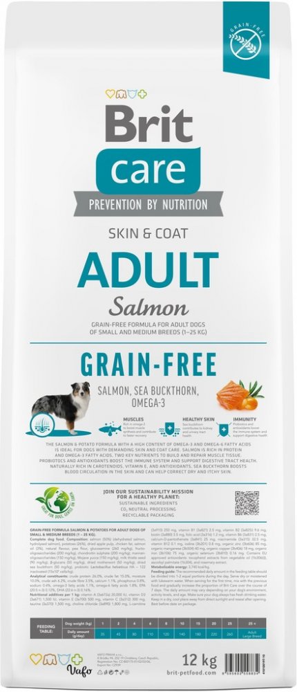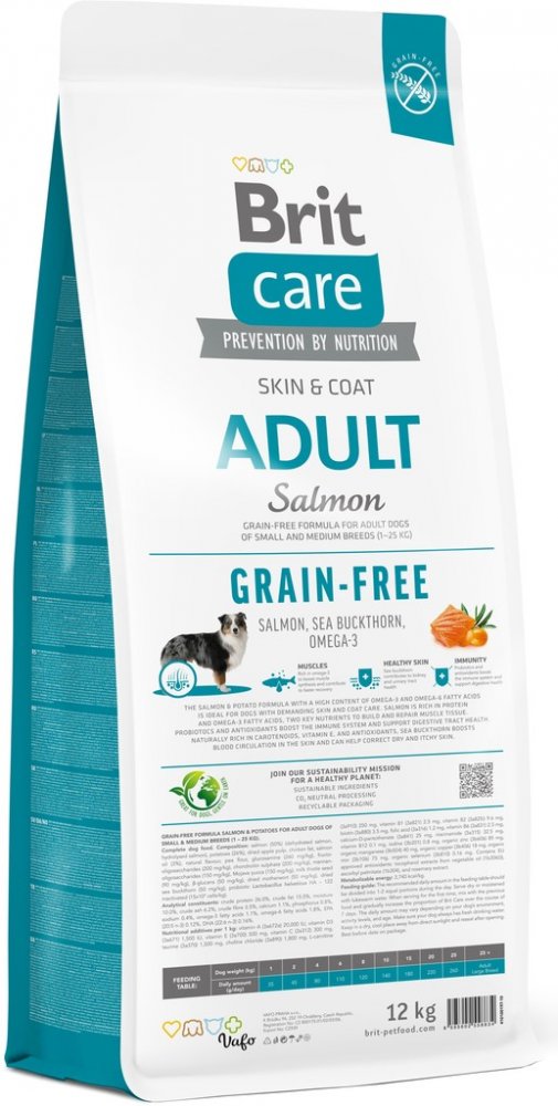 Vafo pro dospělé pro malá a střední plemena s běžnou aktivitou lososové brit care 12 kg superprémiové suché na podporu imunity 10.0 mm tvrdé Brit Care Grain-free Adult 26 % zelenina Losos z České republiky střední (200-500mg) 15 % 3.5 % 1.1 % 0.8 % 6.2 % 0.4 % 0.16 % vysoká deklarováno (>40%) preventivní (p>1,0%) základní pro citlivé trávení (7–10 dní) aktivní (probiotika) možné plná (země + dodavatel) ASC