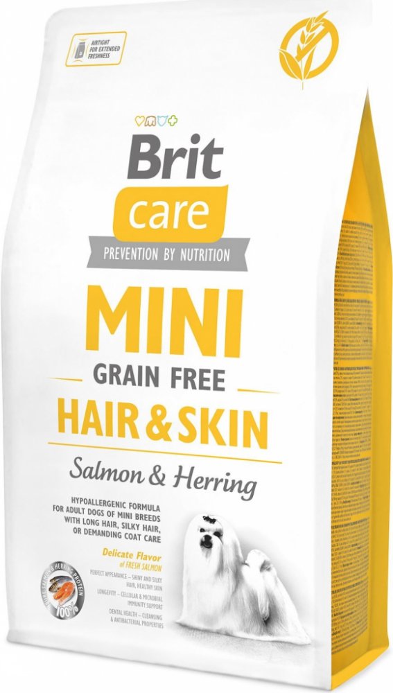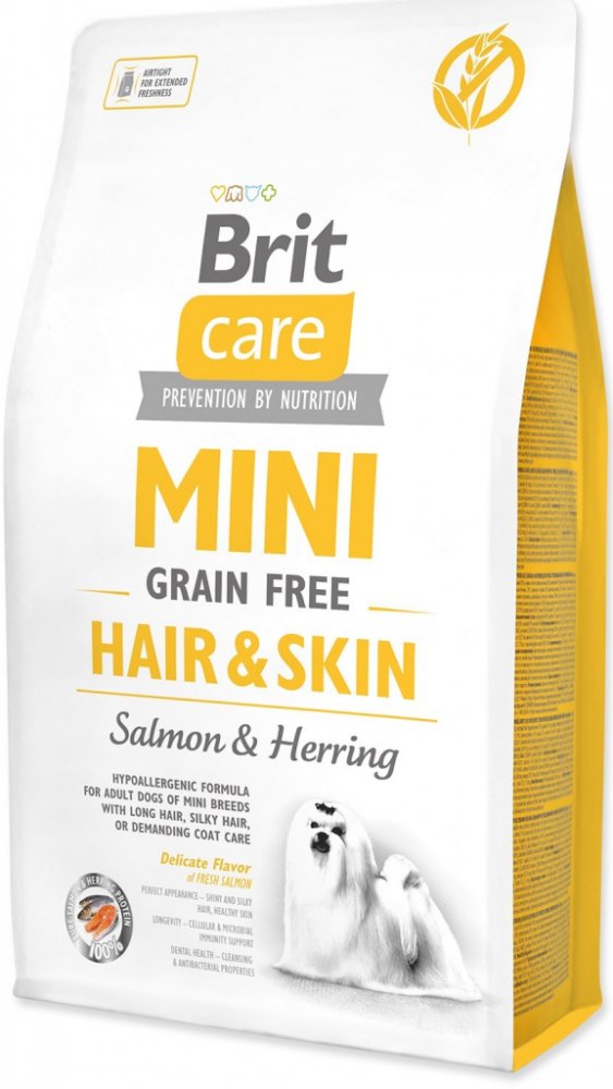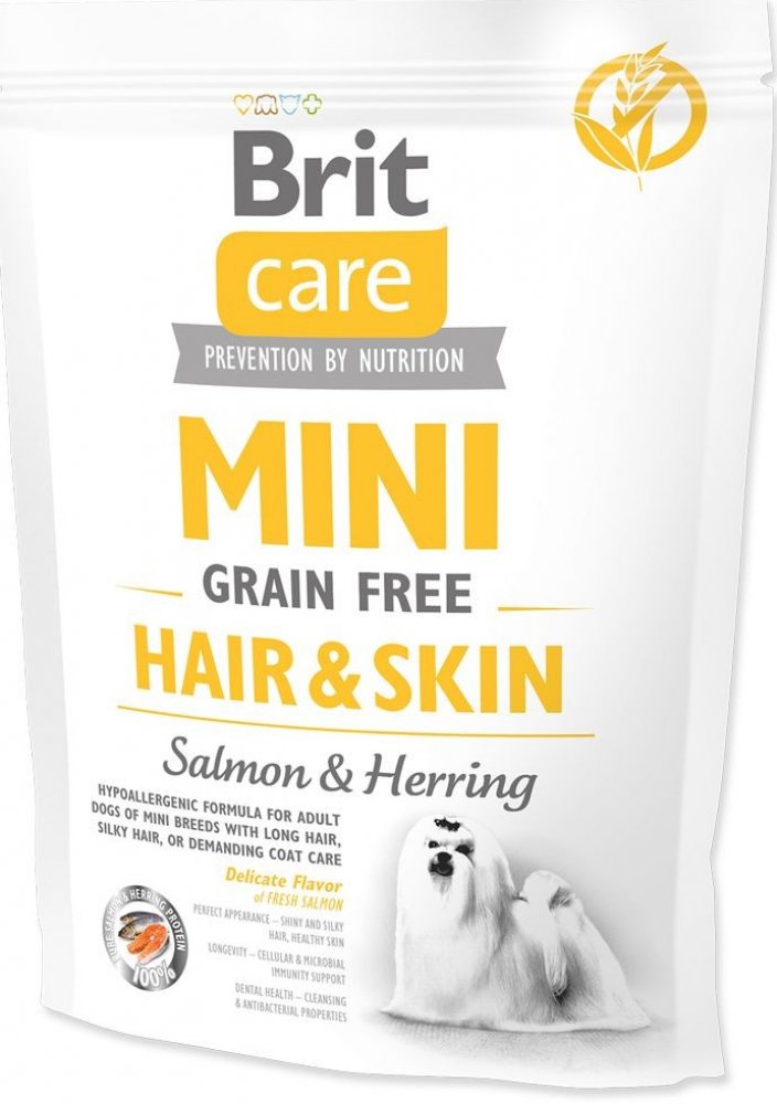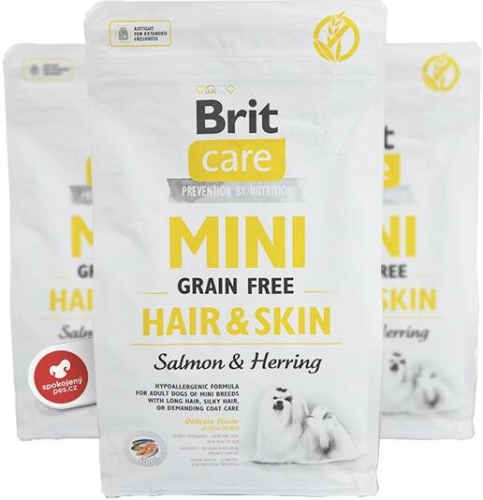 Mini Grain Free Hair & Skin od Brit splňuje specifické nároky miniaturních plemen na výživu. Díky své velikosti se pejsci pohybují více v prachu a jiných škodlivinách. To způsobuje, že jsou psi náchylnější ke stresu, ale i k problémům se srstí a kůží. Právě proto je nutné podporovat jejich imunitu právě dobrou a kvalitní stravou z řady Brit Care Mini. Receptura granulí Brit Care Mini je navržena tak, aby splňovala veškeré potřeby malých psů.