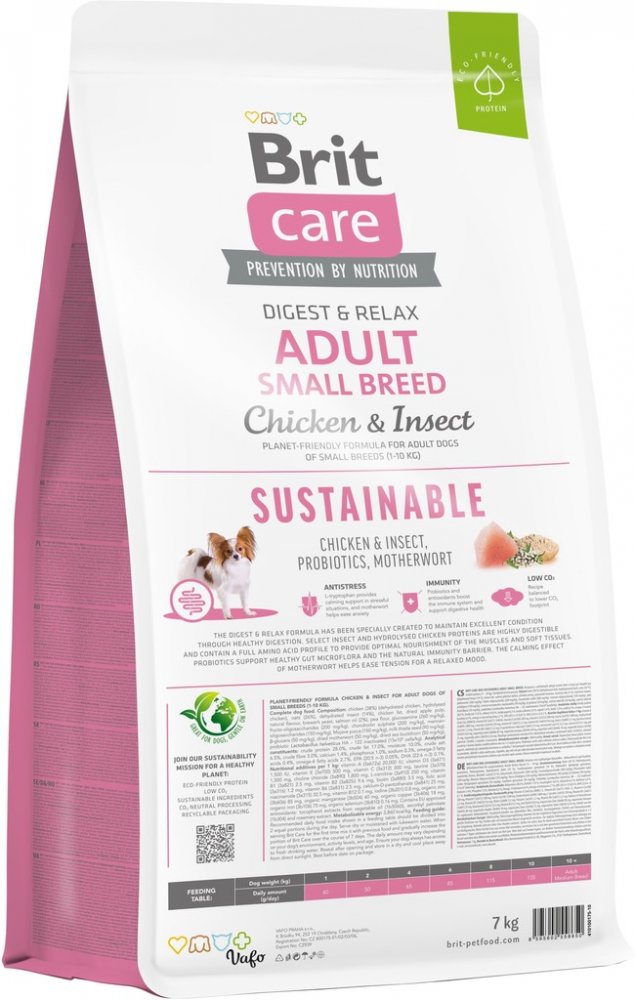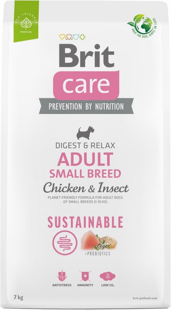 Řada Brit Care je vyvinuta speciálně s ohledem na pokrytí zvýšených denních potřeb malých plemen. Receptura obsahující kuřecí maso v kombinaci s hmyzím proteinem je zaměřena na dospělé psy malých plemen. Krmivo nejen podporuje zdravé trávení, také přispívá ke snížení stresu a zlepšení kondice. Je obohaceno o srdečník a probiotika. Krmivo je obohaceno o aminokyseliny, které jsou potřebné pro rekonvalescenci svalů a tkání. Krmivo je plné kvalitních bílkovin, je lehce stravitelné a neobsahuje lepek.