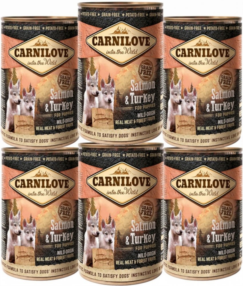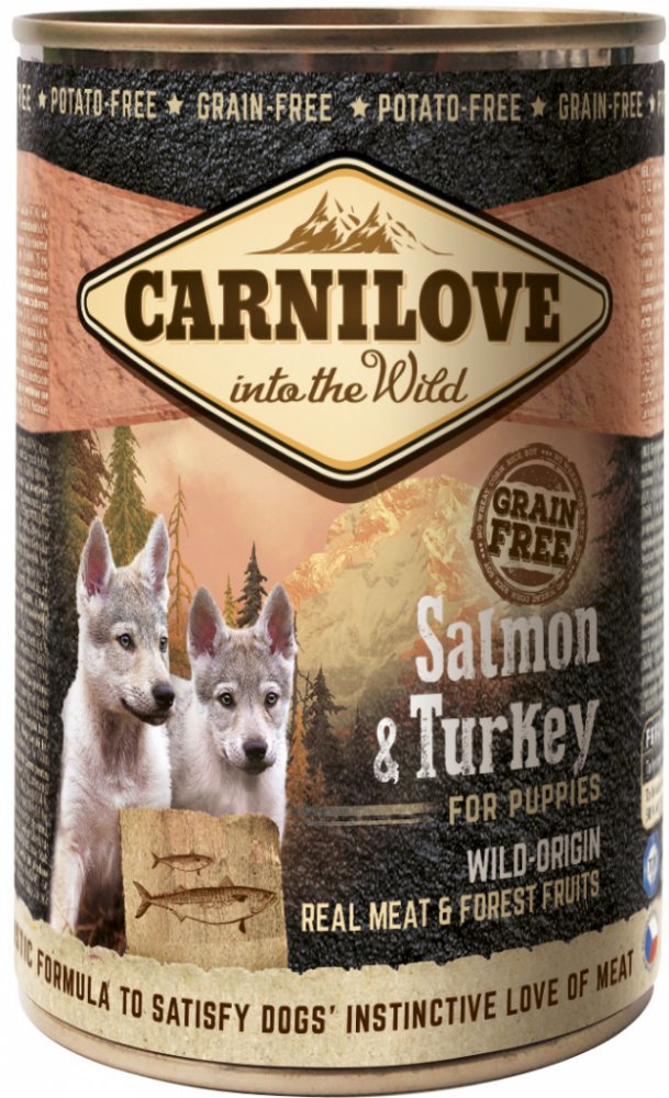 Bezobilné masové paté pro štěňata a mladé pejsky s lososem a krocanem. Výborný konzervovaný doplněk stravy (možno užívat samostatně nebo s granulemi). Složení konzervy pro psy je velmi bohaté na přirozené živiny a obsahuje vysoký podíl kvalitních a vysoce stravitelných proteinů. Losos je zdrojem vysoce stravitelných proteinů, obsahuje omega-3 nenasycené mastné kyseliny, které pozitivně ovlivňují mentální vývoj, kardiovaskulární soustavu a metabolismus jedince (snižují obsah krevního cukru). Rybí maso má pozitivní vliv na kvalitu a vzhled srsti a kůže. Krocan je bohatým zdrojem stravitelných proteinů s vysokým obsahem stopových prvků (zejména zinku). Dále obsahuje vitamíny B3 a B6, které silně ovlivňují činnost mozku, svalový tonus a jsou nezbytné pro zdravý růst. Konzervy Carnilove pro štěňata i dospělé psy jsou označovány Grain Free a Potato Free - bez obilovin a bez brambor.