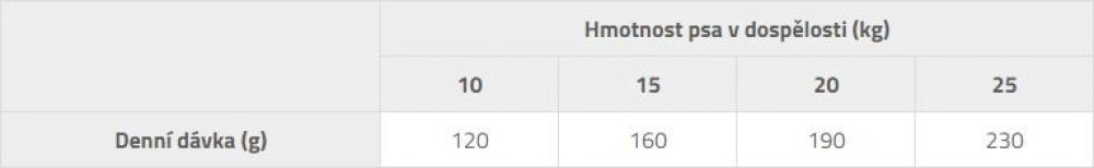 Analytické složky: hrubý protein 26,0 %, obsah tuku 15,0 %, vlhkost 10,0 %, hrubý popel 7,0 %, hrubá vláknina 2,2 %, vápník 1,5 %, fosfor 1,1 %, omega-3 0,2 %, omega-6 1,7 %