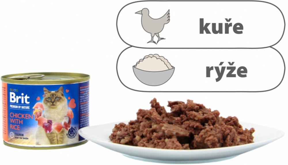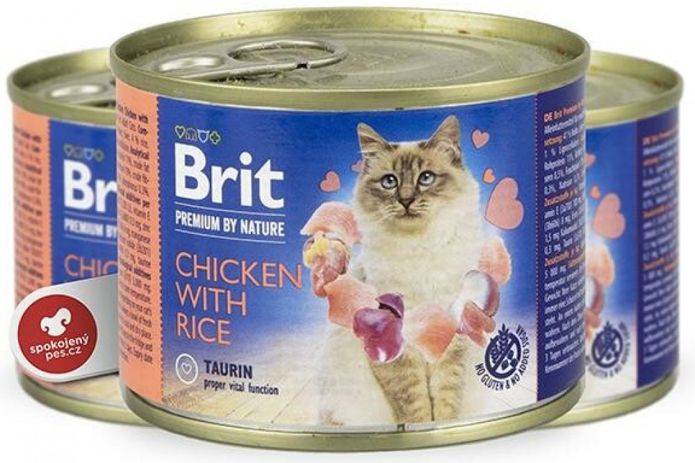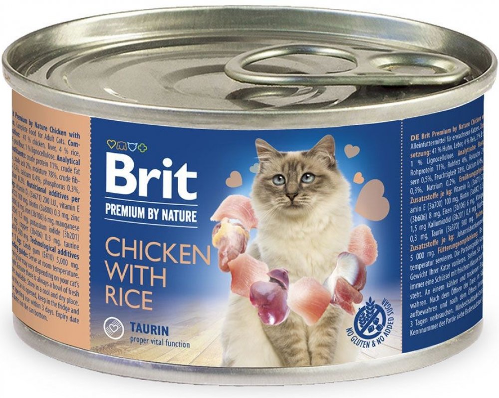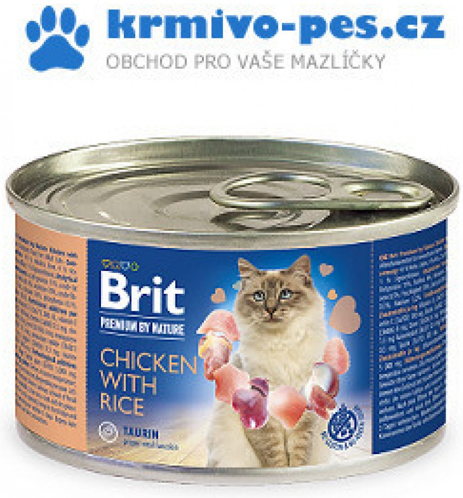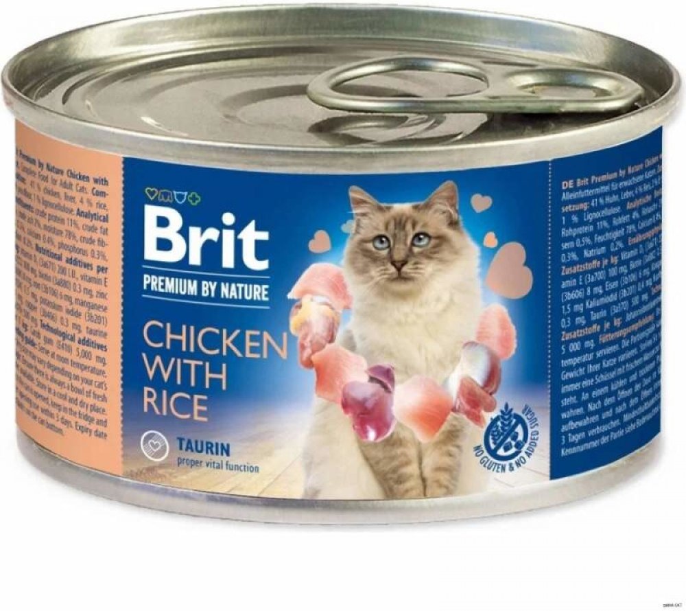 Kompletní krmivo Brit Premium By Nature pro dospělé kočky je ve formě velmi jemného a krémového paté ("mousse"). Pro výrobu byly použity přírodní zdroje surovin s ohleden na prospěšnost pro zdraví koček. Není doplněno o žádná barviva a zchutňovadla. Masová konzerva pro kočky uspokojí i ty hodně vybíravé. Do krmiva je přidán taurin, který podporuje ostrost zraku a správnou strdeční činnost. Konzervy jsou bez lepku, který je původcem častých alergií, a bez přidaného cukru. Masovou směs v konzervě lze podávat i jako doplňkové krmivo ke granulím.