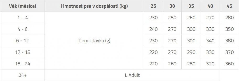 - Optimální růst a zdravý vývoj: Složení krmiva je přizpůsobeno potřebám štěňat velkých plemen, která rostou rychle a vyžadují vyvážený přísun živin pro zdravý vývoj kostí, kloubů i svalů.
