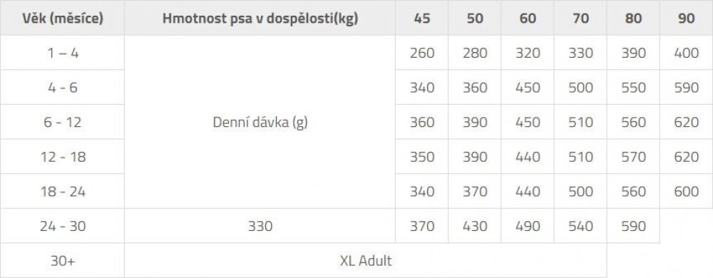 Velmi vyvážené pro kontrolovaný růst XL plemen.