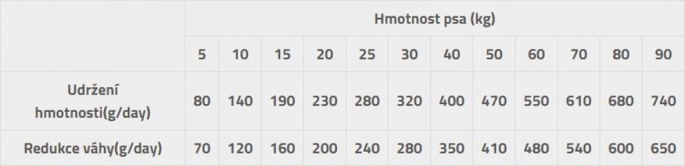 Doporučení krmení: denní dávka psů udržování hmotnosti snižování hmotnosti 5 kg 80 g 70 g 10 kg 140 g 120 g 15 kg 190 g 160 g 20 kg 230 g 200 g 25 kg 280 g 240 g 30 kg 320 g 280 g 40 kg 400 g 350 g 50 kg 470 g 410 g 60 kg 550 g 480 g 70 kg 610 g 540 g 80 kg 680 g 600 g 90 kg 740 g 650 g