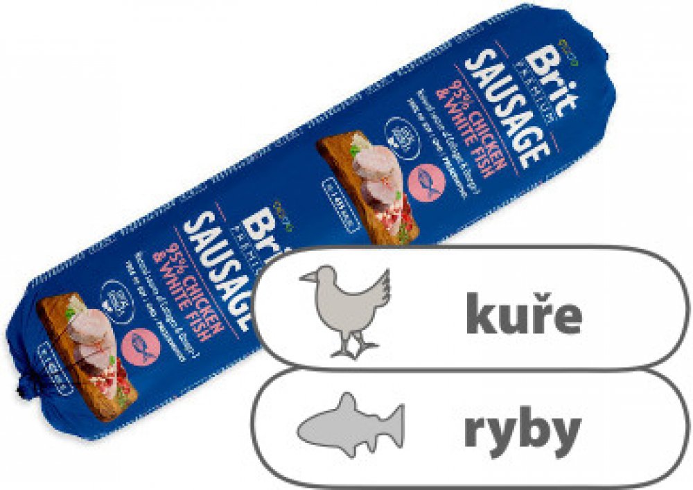 Salám Brit Sausage kuře a bílá ryba je lahodné krmivo s vysokým obsahem masa. V salámech Brit Premium je vždy 95 % masa.