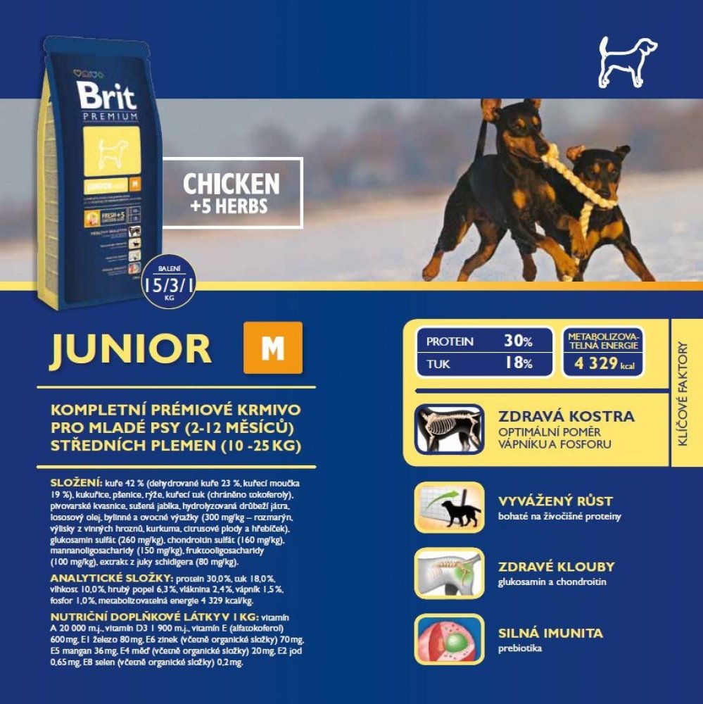 Brit Junior je kvalitní premiové krmivo s vysokým obsahem drůbežího masa. Vyvážený poměr vápníku a fosforu přispívá ke zdravému vývoji kostry a kloubů a zajišťuje optimální růst bez nadměrné zátěže pro organismus.