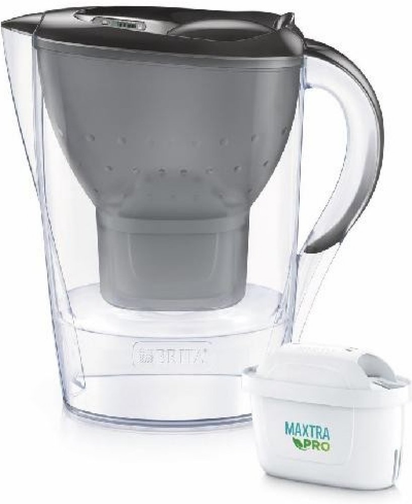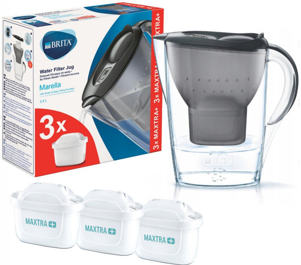 BRITA Marella ŠEDÁ 2,4l Filtrační konvice - celkový objem 2,4l, objem přefiltrované vody 1,4 l, elektronický indikátor výměny filtru, vhodné do myčky (bez víčka), počet filtračních patron v balení 3 ks. KLÍČOVÉ VLASTNOSTI: • Filtrační konvice na vodu v moderním designu • Vejde se do dveří ledničky • Praktické plnění jednou rukou • Konvici lze bez víčka mýt v myčce na nádobí • ...