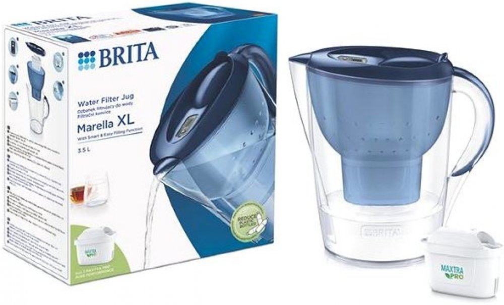 Brita Filtrační konvice Marella XL 3,5l, modrá 2024 - podrobné informace: Konvice má ergonomický úchop, celkový objem konvice je 3,5l, objem filtrované vody 2l. Díky odklopnému víčku lze konvici plnit jednou rukou. Konvice je vybavena digitálním indikátorem výměny filtru, který napoví, kdy je správný čas na výměnu filtru. To je potřeba dělat každý měsíc, či po přefiltrování 150l vody. Lze mýt v myčce na nádobí (bez víka). Balení obsahuje detailní návod na použití. Spolehlivá filtrace Brita Perfect Fit při použití filtrů Brita MAxtra+ nebo Maxtra Pro....