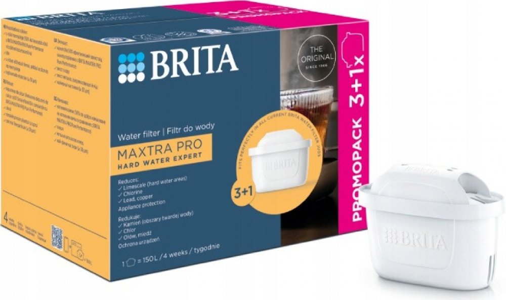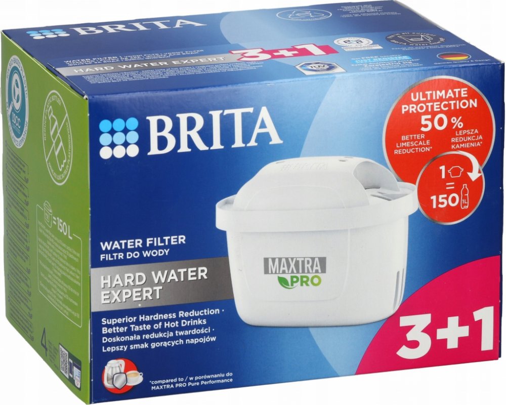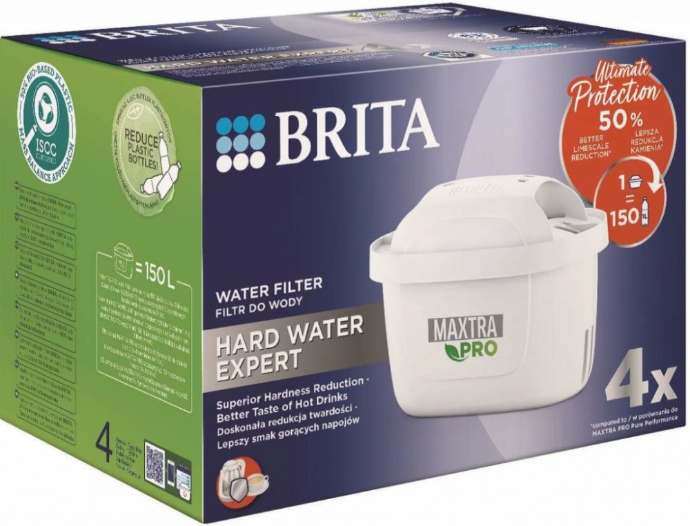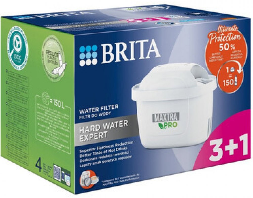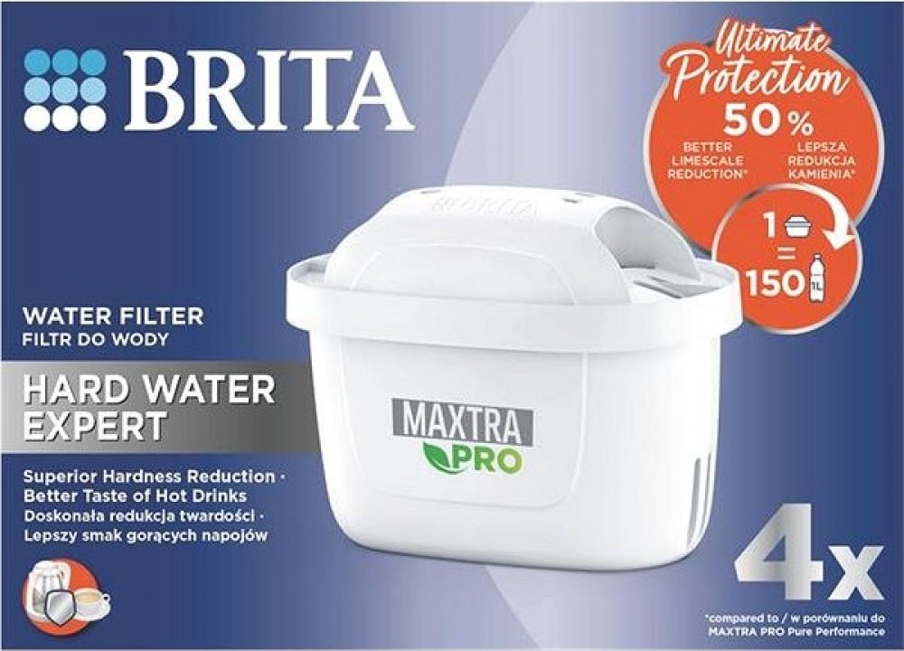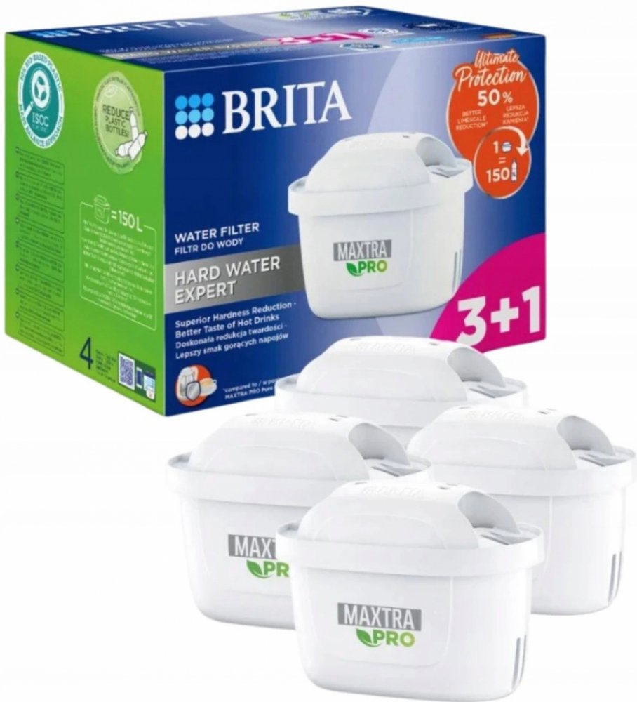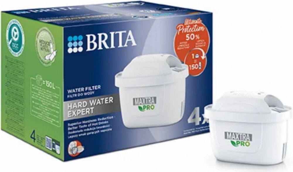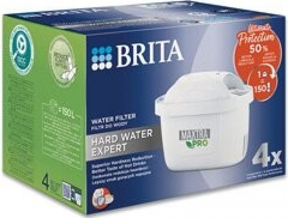 Vodní filtr Maxtra Pro Hard Water Expert, 4 ksObsahuje 4 ks filtru (ideální pro 4 měsíce filtrace).Redukuje vodní kámen - o 50% efektivněji v porovnání s MX Pro PO verzí.Redukuje také látky ovlivňující chuť a aroma vody jako je chlór, olovo měď.Zlepšuje chuť kávy a čaje a chrání spotřebiče před vodním kamenem, čímž prodlužuje jejich životnost.1 filtr nahradí až 150 ks balených plastových lahví (1 l), kapacita filtru je 150 l, doporučujeme vyměnit každé 4 týdny.Plastová skořápka je vyrobena z 50% z bioplastů.Ideální pro lokality se středně až velmi tvrdou vodou.2 výkonné superjemné síťky zadržují částice z potrubí. (+1 síťka oproti MX+) 4× lepší zachycení částic oproti MX+.Kompatibilní se všemi Brita filtračními konvicemi.Všechny filtry Brita jsou recyklovatelné, vracejte do recyklačních boxů a pomáhejte tak šetřit přírodu. Seznam recyklačních pointů najdete na www.brita.cz