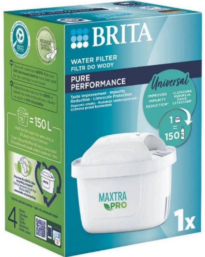 Filtrační vložka Brita Maxtra Pro představuje nejpokročilejší technologii pro filtrování vody od předního německého výrobce. Oproti předchozí generaci Maxtra+ je vybavena vysoce výkonnou filtrační síťkou, která je 4× účinnější při zadržování mechanických částic. Účinně redukuje chlór a jiné nežádoucí látky ovlivňující chuť, vodní kámen, stopy těžkých kovů, herbicidy, pesticidy, léčiva a jiné nečistoty. Díky filtru je výsledná voda čistší, chutnější a měkčí. Jedna patrona přefiltruje až 150 litrů vody a může být používána po dobu čtyř týdnů. K dispozici v baleních 1 ks, 3 ks nebo 6 ks. Brita Maxtra Pro Pure Performance je filtr ideální pro použití s měkkou až středně tvrdou vodou. Filtrační směs tvoří iontoměnič v podobě syntetické pryskyřice a mikročástice aktivního uhlí, které jsou vyrobeny ze skořápek kokosových ořechů. Tělo patrony je z 50 % tvořeno bioplastem, který lze recyklovat v rámci recyklačního programu Brita. Tento plast neobsahuje BPA a je tedy vhodný pro kontakt s pitnou vodou. Pro lokality s tvrdou vodou doporučujeme filtrační vložku Brita Maxtra Pro Hard Water Expert. Čtyři stupně filtrace Jemné sítko zachytí hrubé mechanické částice, které mohou pocházet např. ze starších vodovodních řadů. Aktivní uhlí - při kontaktu vody s přírodním mikrokarbonem (vyrobeným z kokosových skořápek) dojde k výraznému snížení látek negativně ovlivňujících chuť a vůni vody - zejména chlóru, pesticidů a herbicidů. Tyto látky se zachytí na porézním povrchu mikročástic aktivního uhlí (Micro Carbon Pearls). Voda tak získá zpět svou čistotu, svěžest a lahodnou chuť. Pryskyřice (iontoměnič) redukuje uhličitanovou tvrdost vody (vodní kámen) a tím chrání vaše spotřebiče a absorbuje těžké kovy (olovo, měď). Extra jemná filtrační síťka zachytí i mikročástice ( ≥ 30 µm).